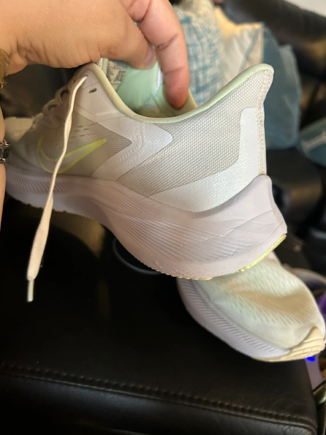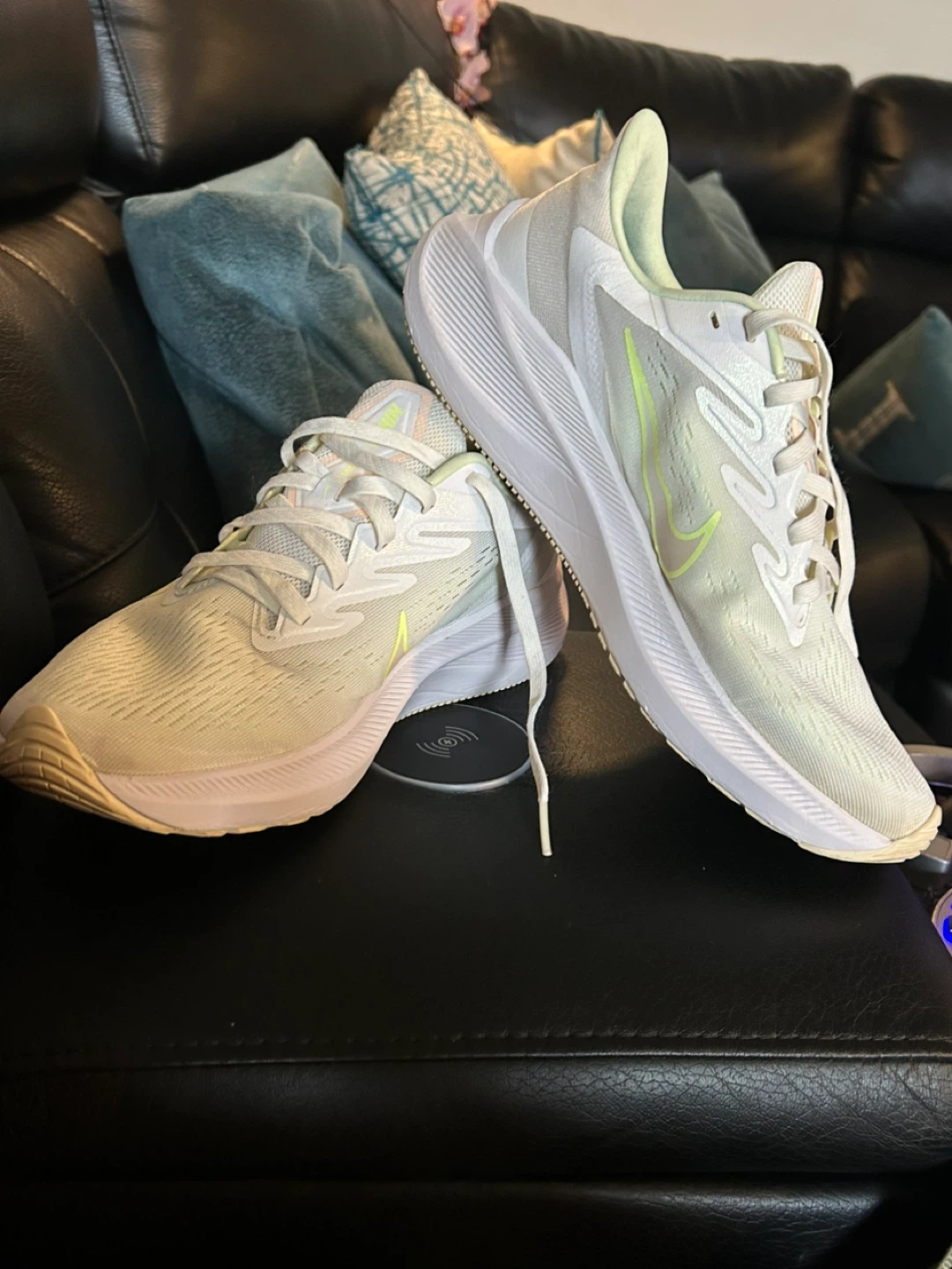 These Nike Air Zoom running shoes are designed for comfort and performance. They feature a breathable mesh upper and a responsive cushioning system. The shoes are a light pastel green with yellow and pink accents. Suitable for road running or everyday wear. open to reasonable offers. I invite you to view my other items; if you are interested in any of them, I will give you a better price.