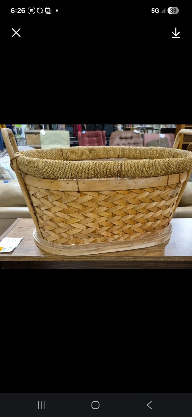 Oval-shaped woven basket with a natural wood and twine construction, with a lining for cleaning ease. It has two sturdy handles for easy carrying. This basket would be handy for storage or as a decorative accent piece!