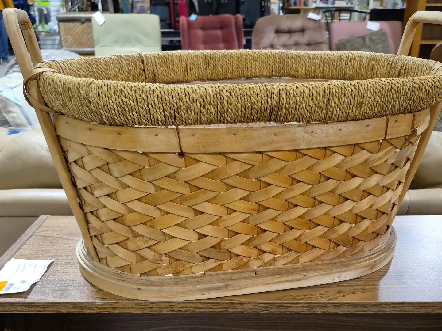 Oval-shaped woven basket with a natural wood and twine construction, with a lining for cleaning ease. It has two sturdy handles for easy carrying. This basket would be handy for storage or as a decorative accent piece!