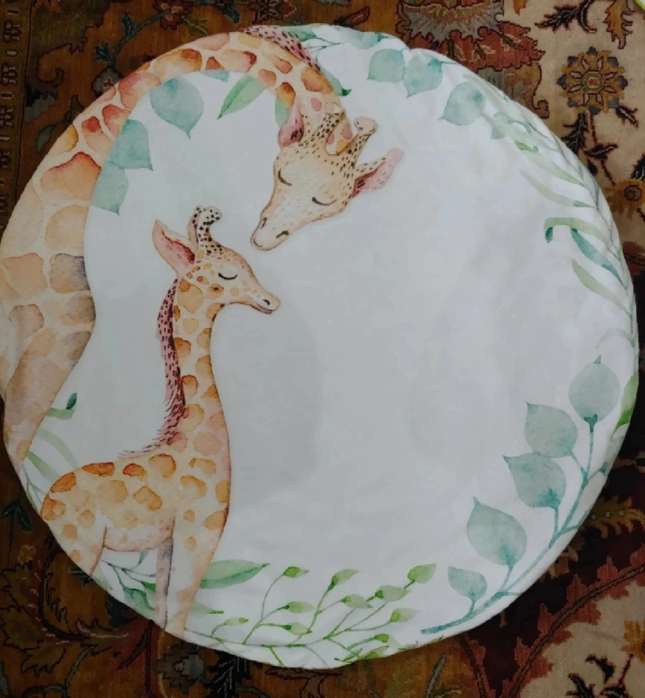 A soft and comfy baby play mat featuring a sweet giraffe design! It's perfect for tummy time or just a safe space for your little one to play. also good for photos! The mat has a cute leaf pattern on one side and giraffes on the other. It's like new, used just for photos, very clean and washed.