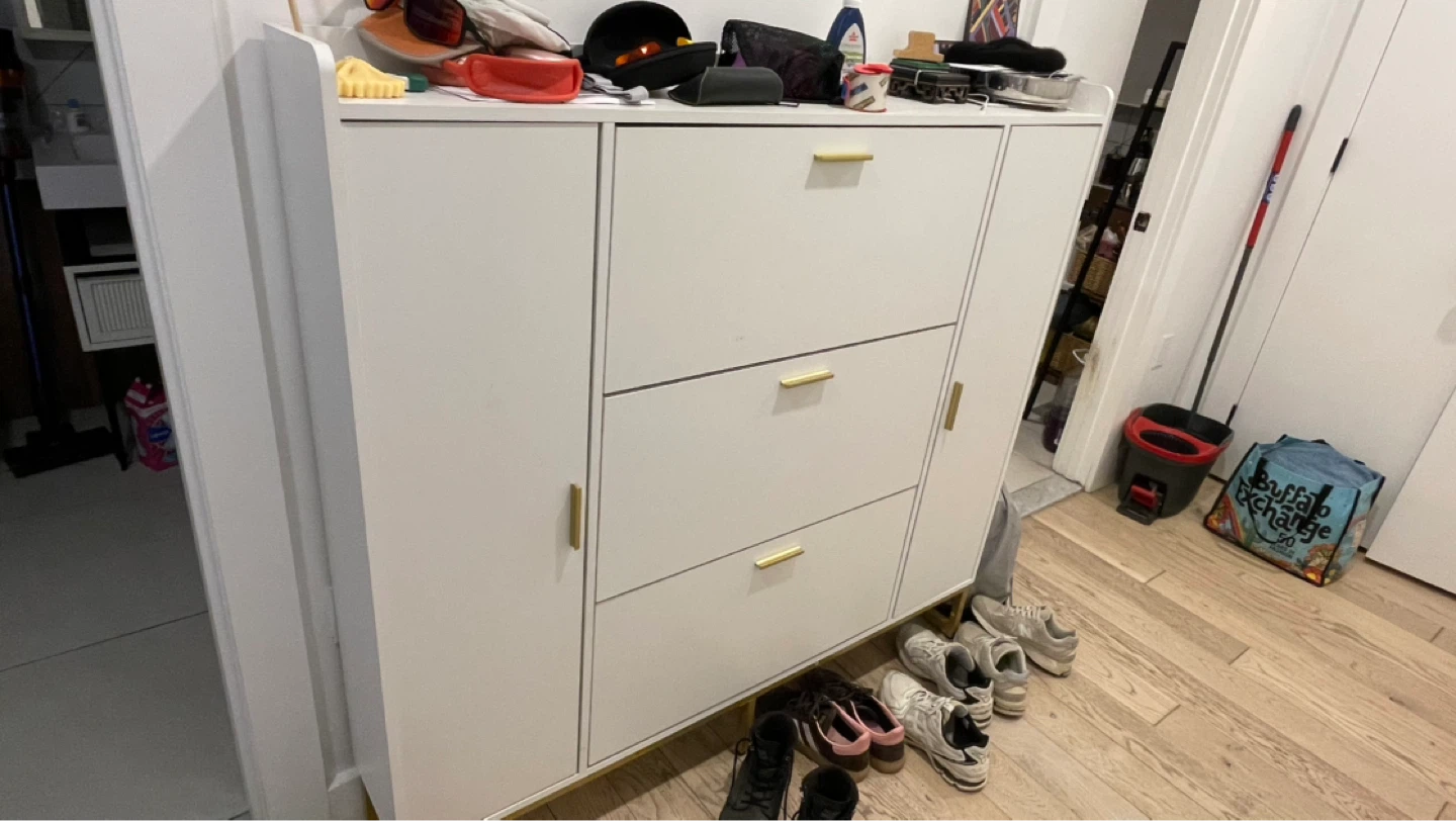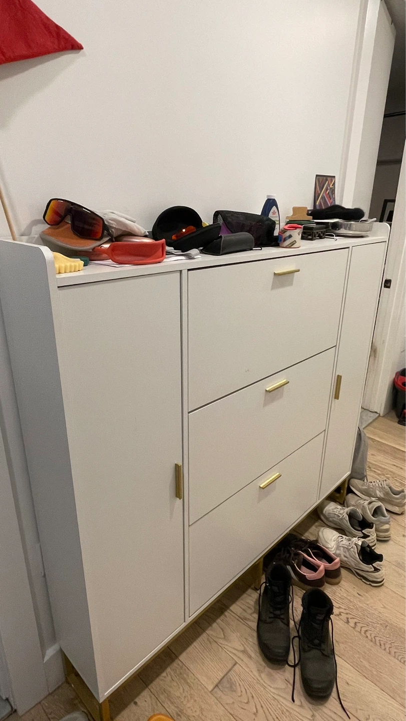 White shoe cabinet with three drawers and side cabinets. It has gold-colored legs. This cabinet provides ample storage for shoes and other items. Its clean design complements various home decors.