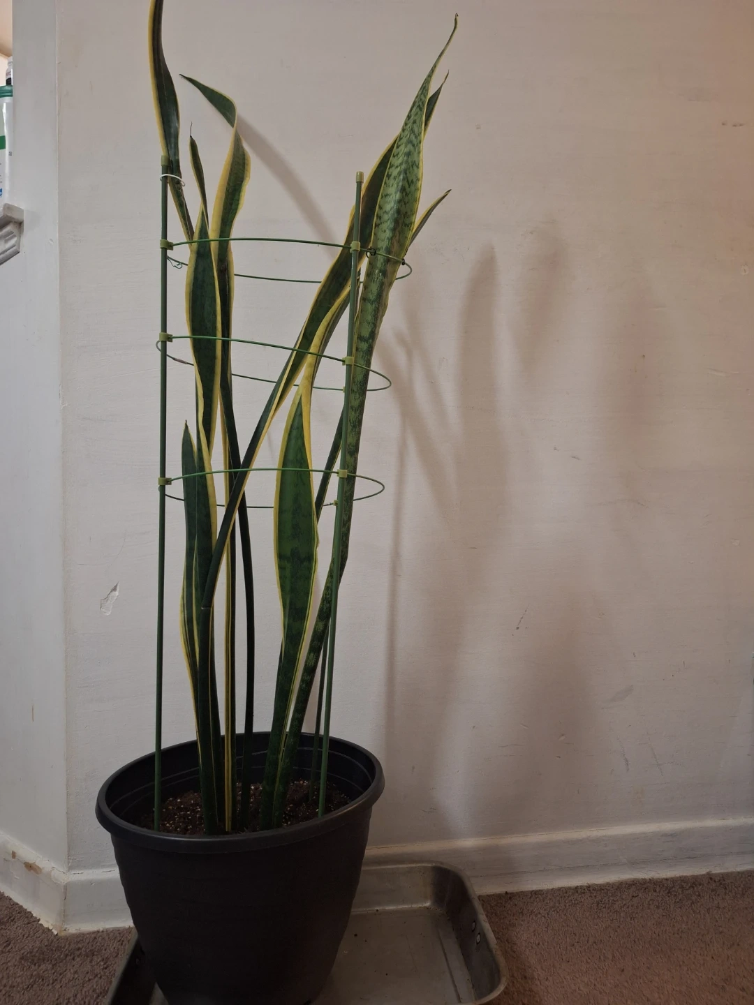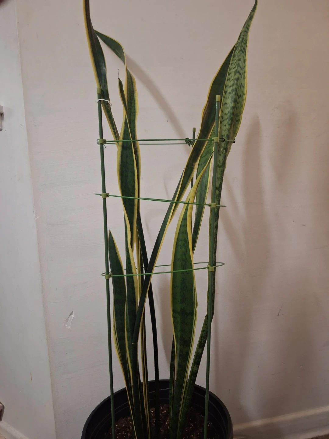 Pick up only.Healthy snake plant in a black pot. Comes with a green plant support to keep its leaves upright. Easy-care houseplant, great for improving air quality! 9.5" pot, 50" tall.