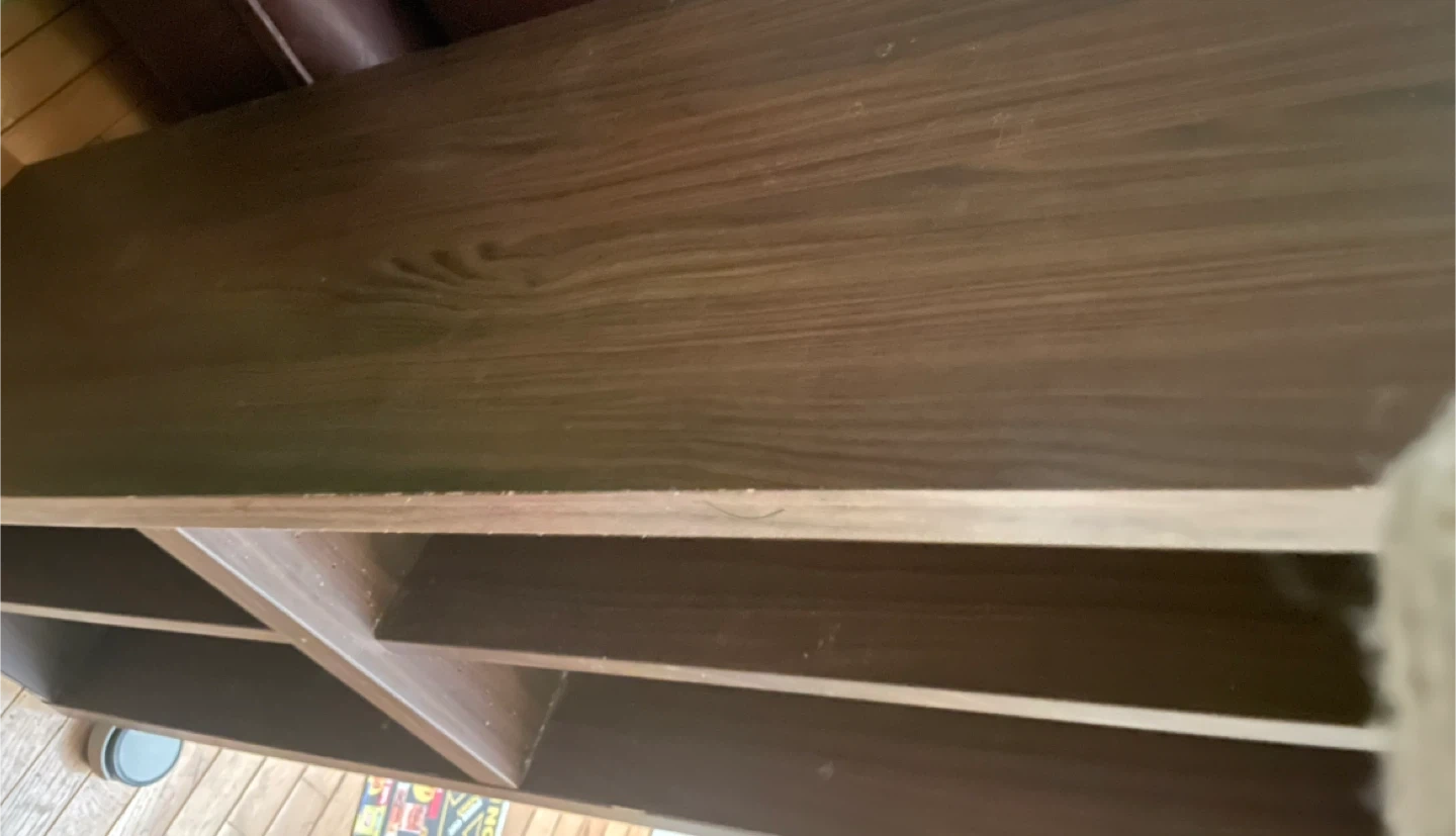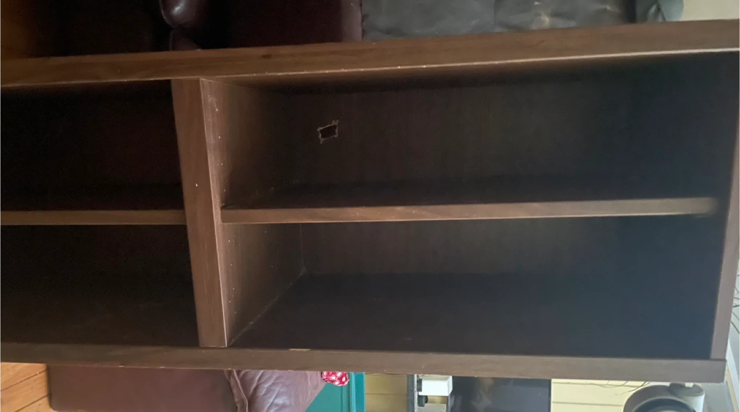 Nice console table with lots of storage on wheels. Has 4 compartments and the shelves are removable. There are a few square cut outs or holes in the back to run cords through.