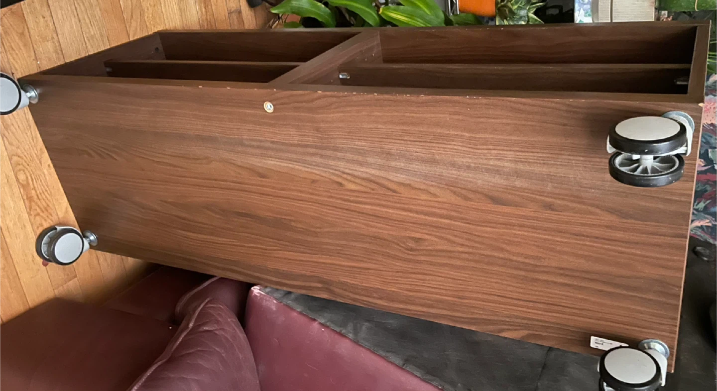 Nice console table with lots of storage on wheels. Has 4 compartments and the shelves are removable. There are a few square cut outs or holes in the back to run cords through.