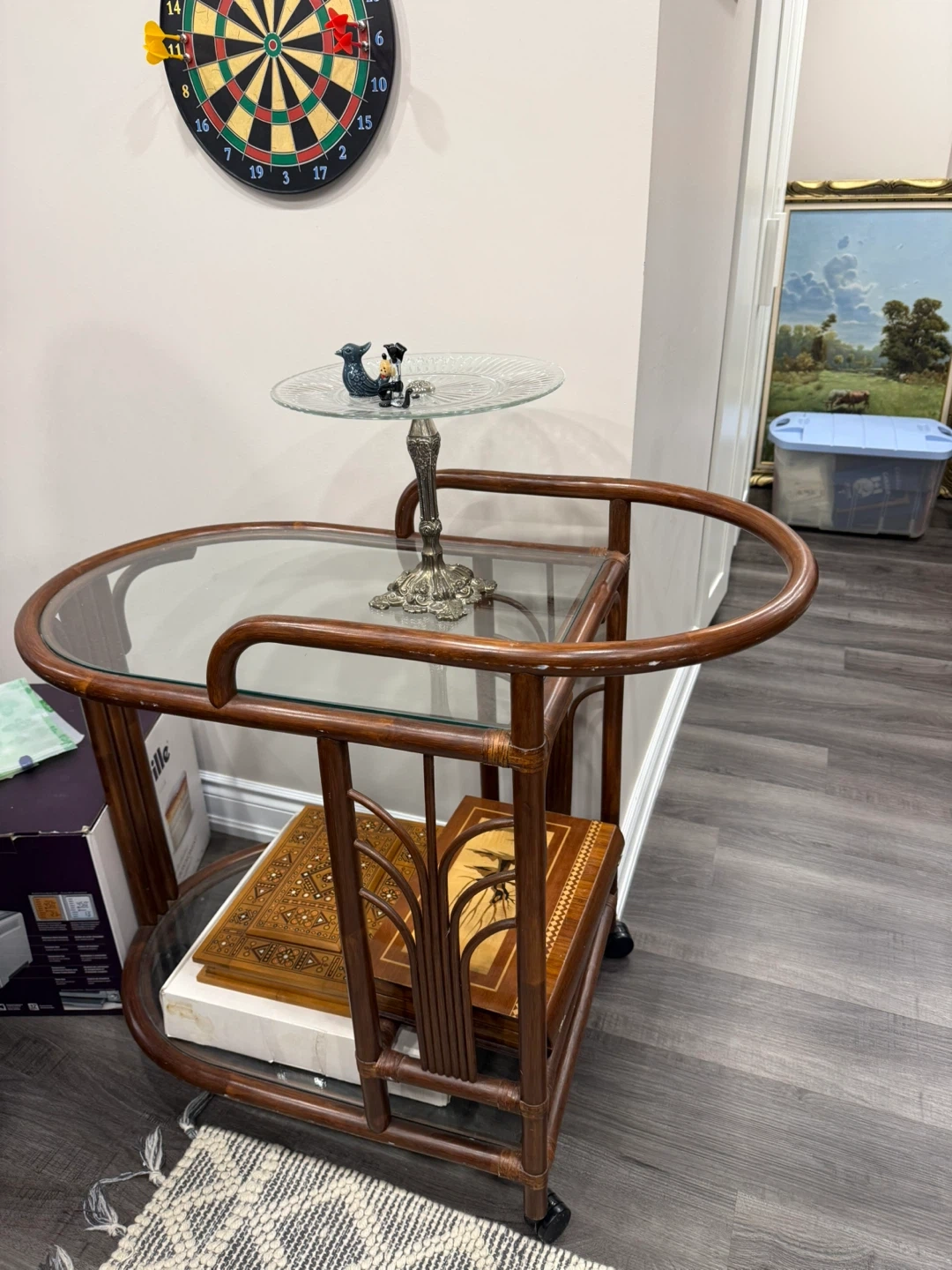 Vintage Rattan Bar Cart with Glass Shelves