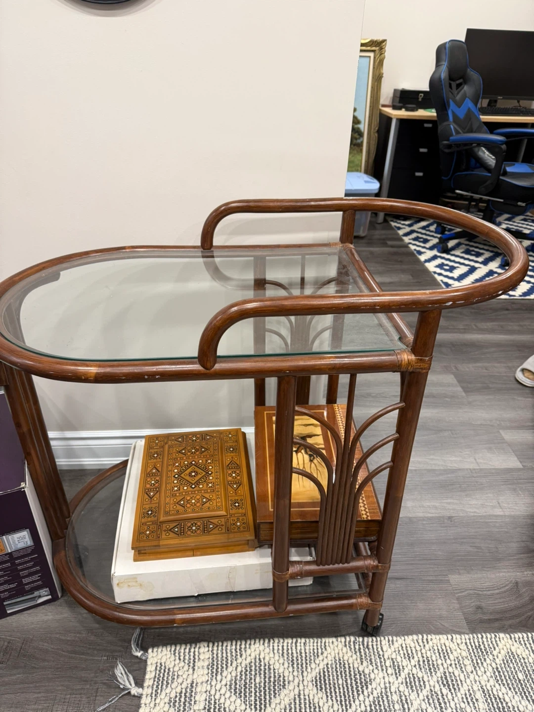 Vintage Rattan Bar Cart with Glass Shelves