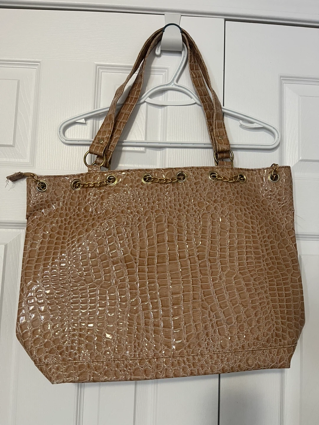 Stylish brown tote bag with a textured crocodile-embossed finish. It features eye-catching gold chain detailing along the top. This spacious bag is perfect for everyday use and adds a touch of class to any outfit!