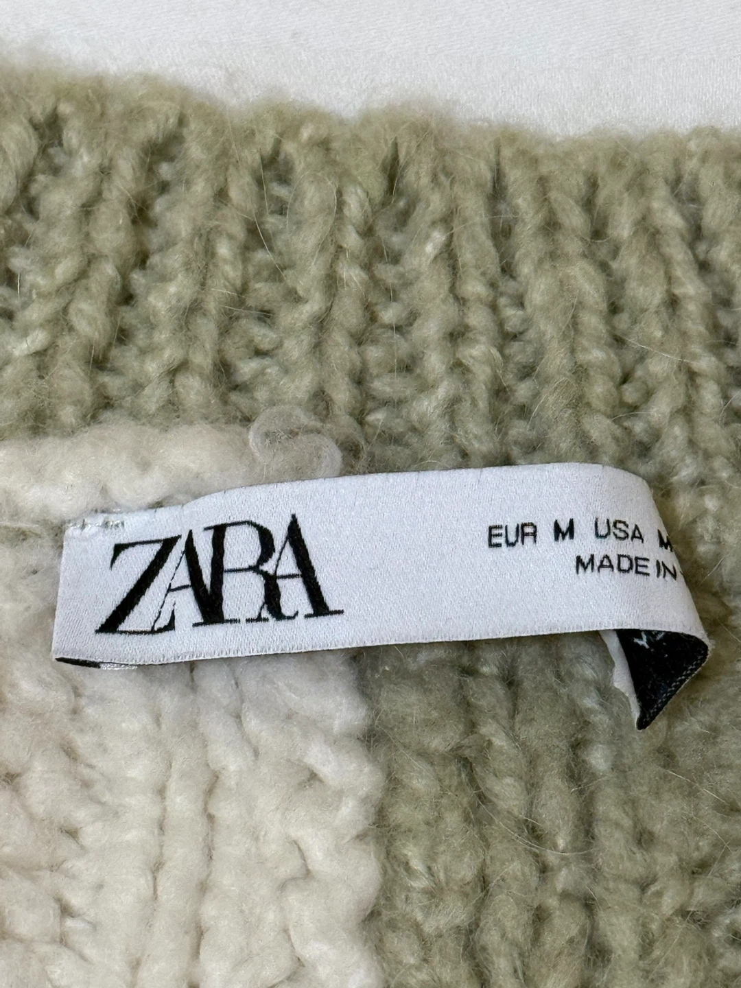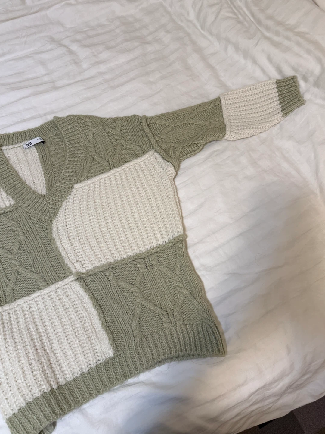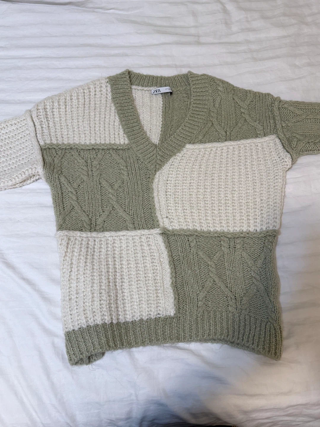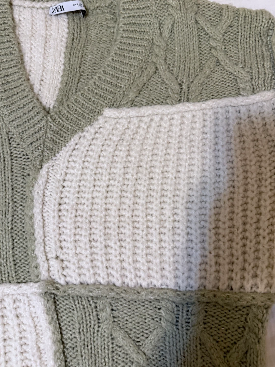 ZARA patchwork knit sweater with a V-neck design. Features a mix of cable knit and ribbed textures in green and cream. Size Medium. Fits oversized. 10% Wool.