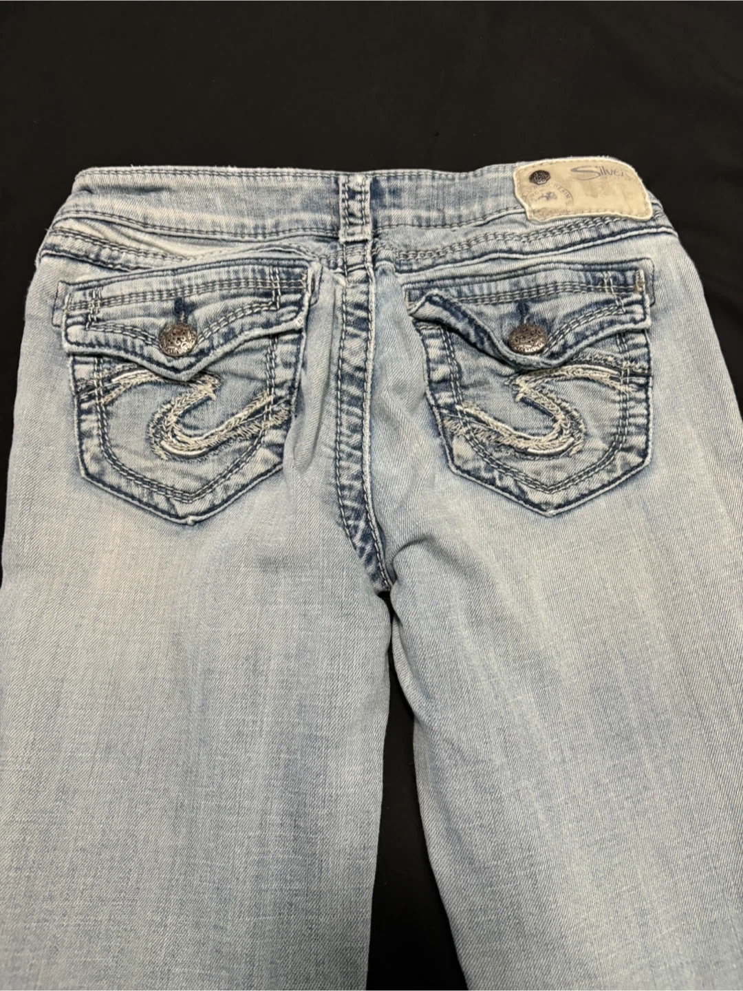 Silver Jeans Co. Women's Tuesday bootcut jeans in a light wash blue. Size 26w x 35 L. Pick up in the Northend.