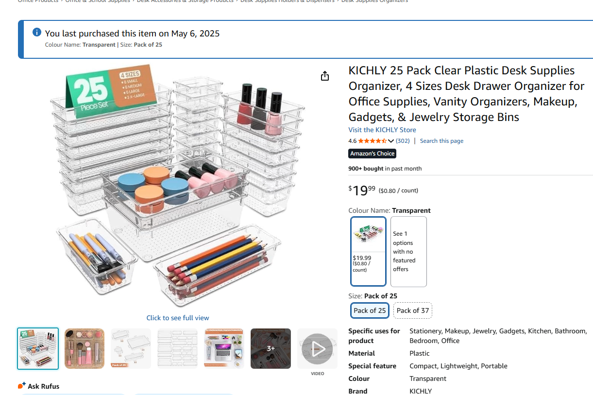 KICHLY 25 Pack Clear Plastic Desk Supplies Organizer, 4 Sizes Desk Drawer Organizer for Office Supplies, Vanity Organizers, Makeup, Gadgets, & Jewelry Storage Bins