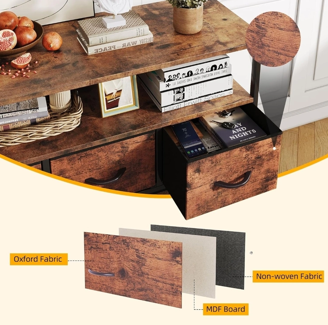 Pick up only. LUKGEL 5 drawer storage unit with shelf can be used as a dresser for Bedroom, Console Sofa Table, or an entryway table. Comes in Rustic Brown colour. Drawers are fabric, but the frame is metal and the shelf and top are MDF with laminate.
