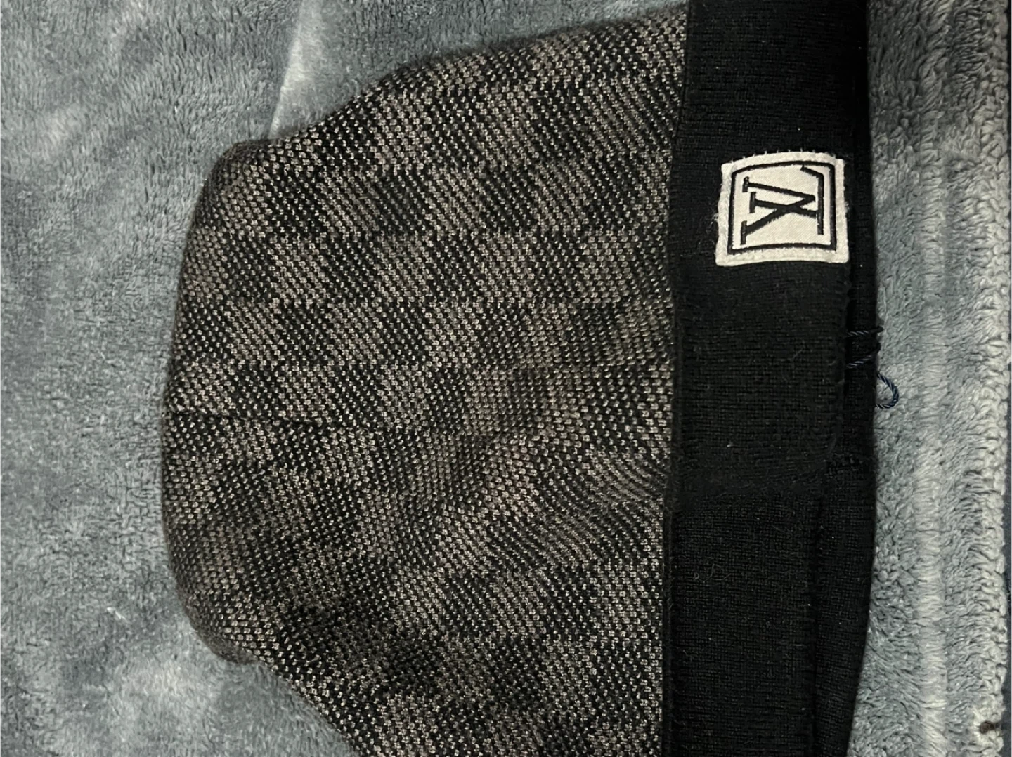 Louis Vuitton cap with signature monogram pattern. Black and grey knit material. Features a black band with a white LV logo patch. It's a stylish accessory for everyday wear.