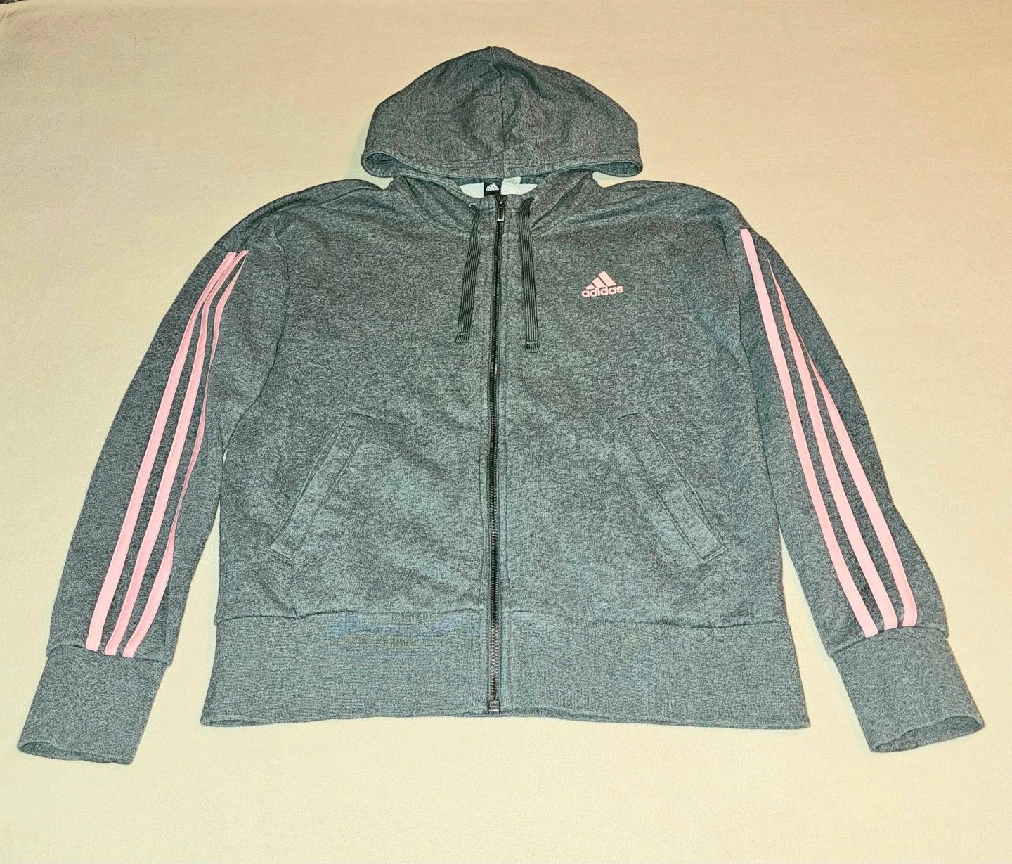 Selling an Adidas zip-up hoodie in grey with pink stripes! It's in great shape and ready for a new owner. The size is M (Medium). Perfect for staying cozy! $7