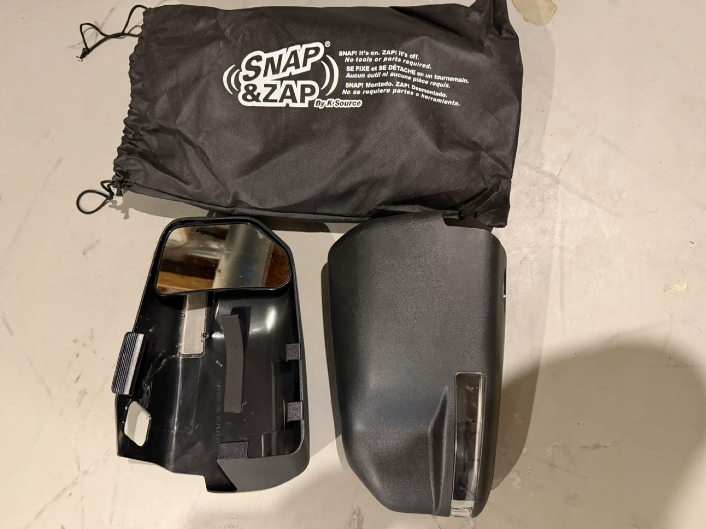 This Snap & Zap towing mirror extension is designed for easy on and off installation without tools or extra parts. It includes the mirror and a protective black drawstring bag. Patent number 09767724 is visible.