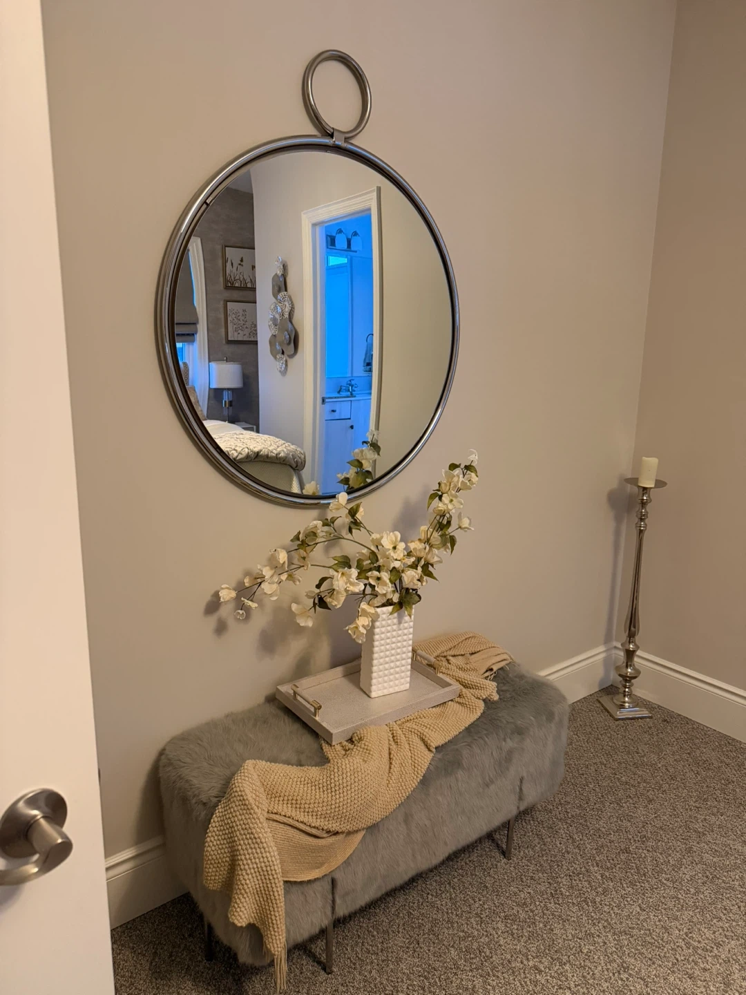 This round wall mirror features a sleek metal frame with a prominent ring accent at the top. It's perfect for entryways or hallways. And fur bench perfect accent for any space and idea for entry way