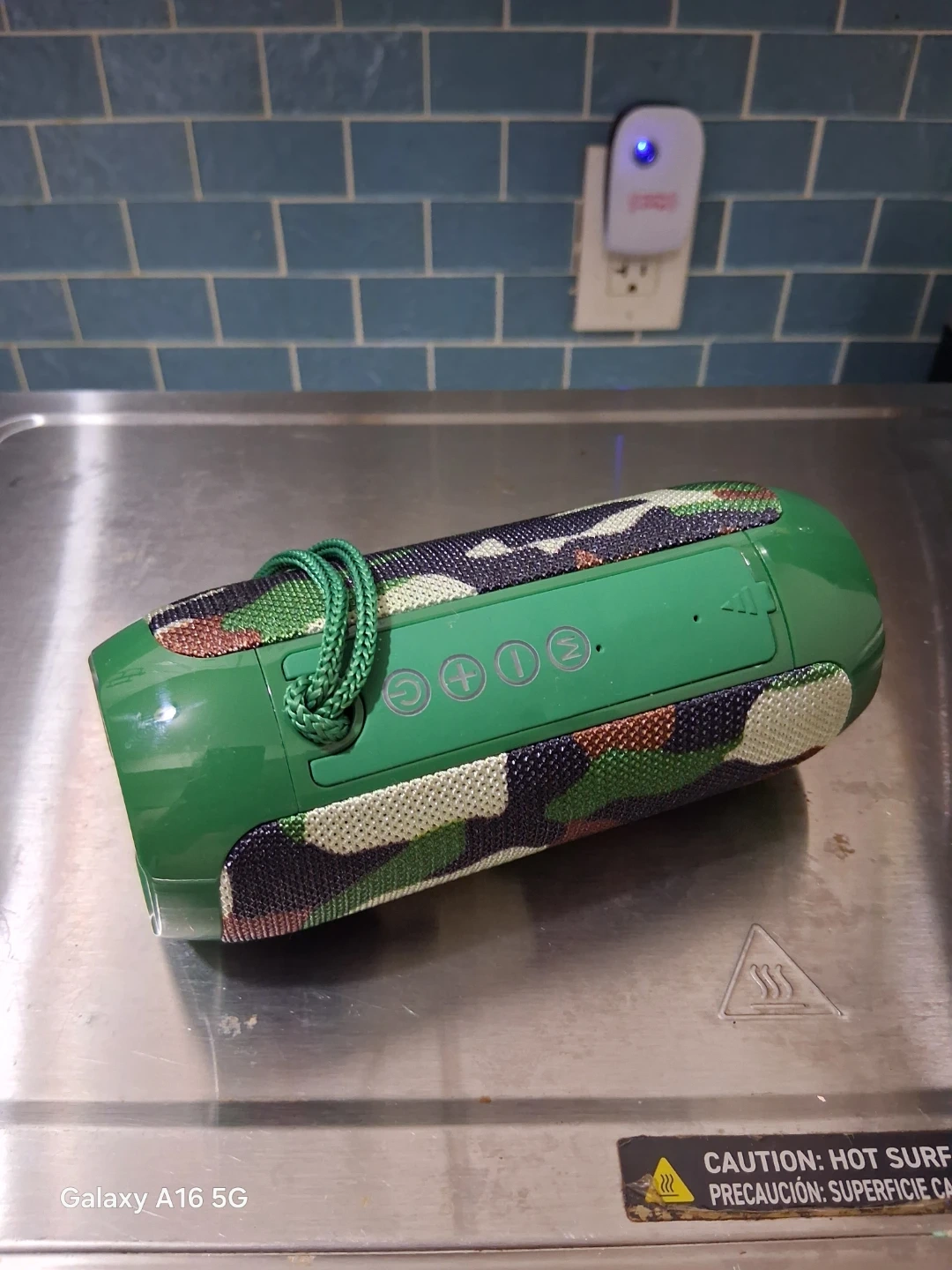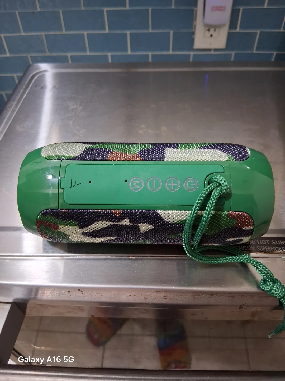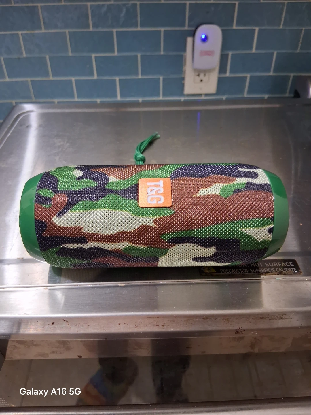 Portable T&G Bluetooth speaker with a camouflage pattern. It has playback controls on top and a convenient carrying strap. This speaker is great for outdoor use!