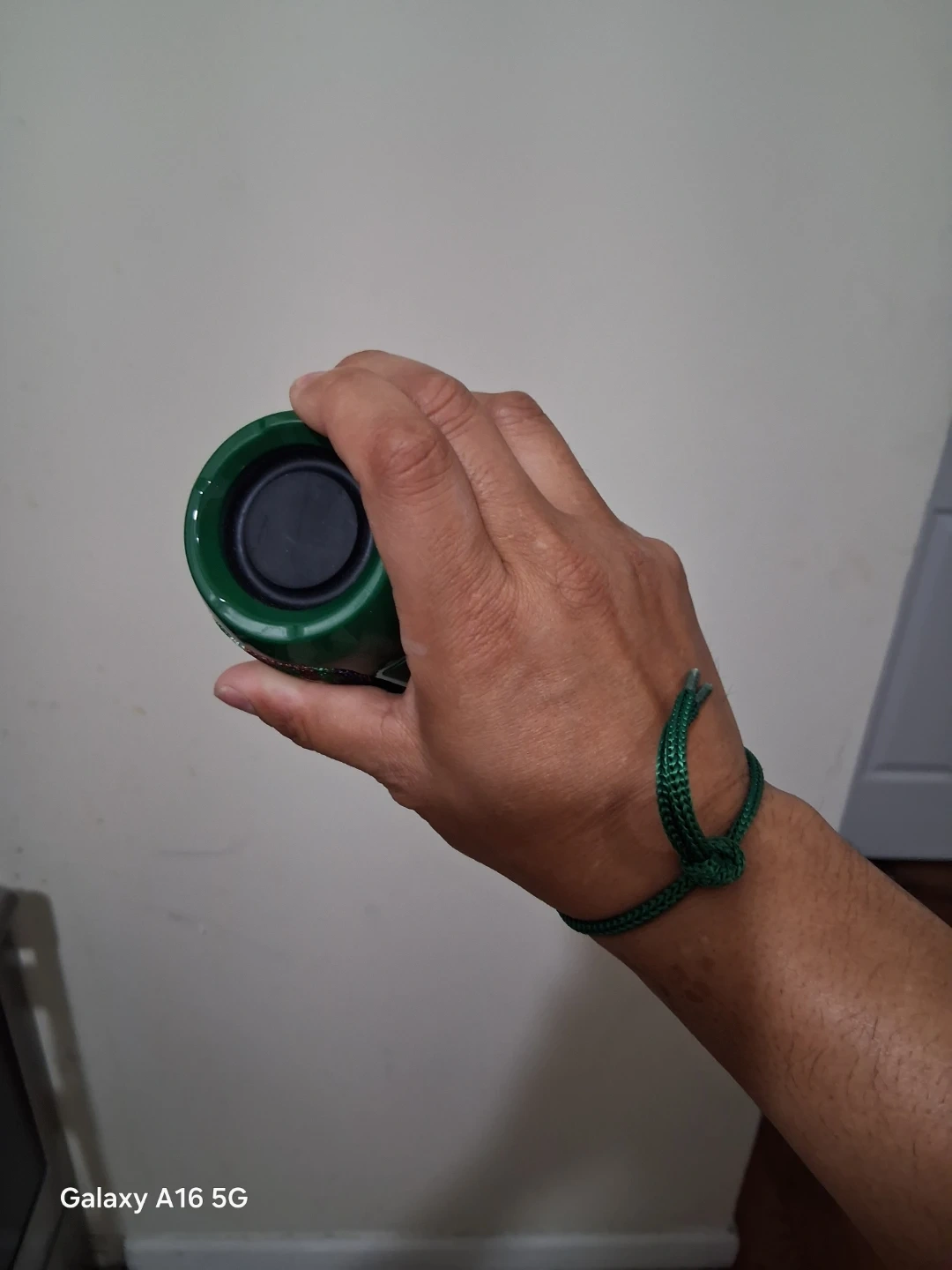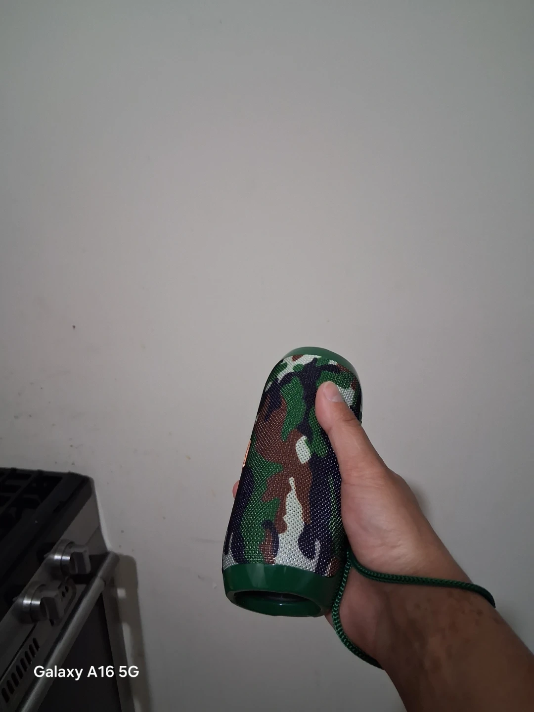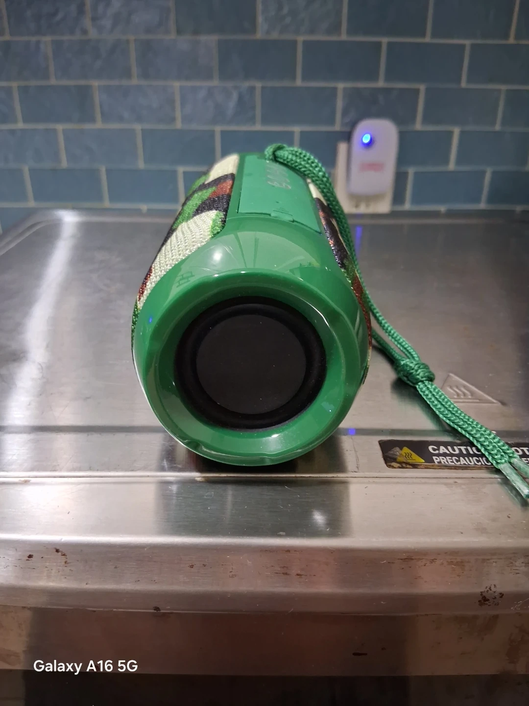 Portable T&G Bluetooth speaker with a camouflage pattern. It has playback controls on top and a convenient carrying strap. This speaker is great for outdoor use!