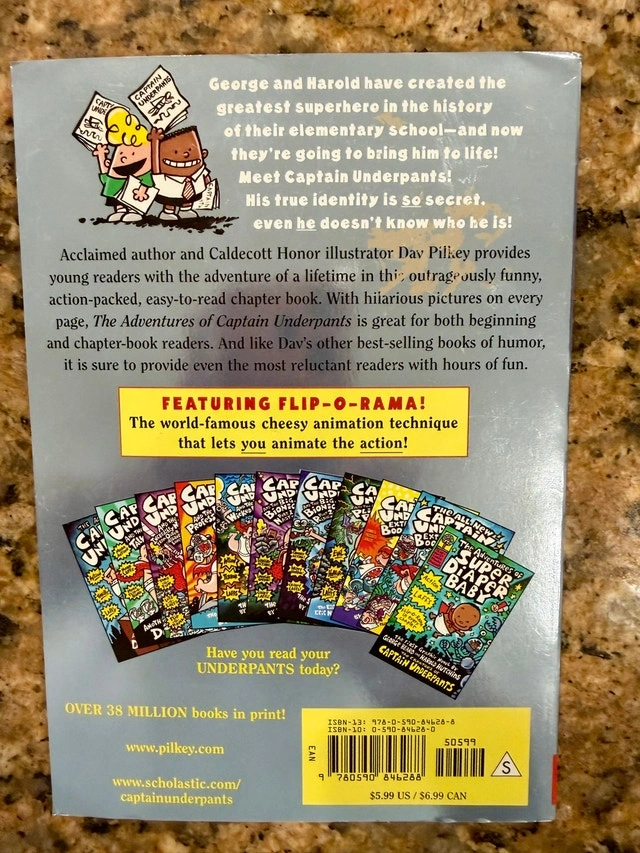 Dive into the hilarious world of "The Adventures of Captain Underpants," the first epic novel by Dav Pilkey! This 1997 First Scholastic paperback edition is packed with action, thrills, and laffs! This book is in good condition, ready for a new generation of readers to enjoy the silly escapades of George and Harold and their outrageous creation. Book shows very minimal wear and tear. It is in great condition. Why not add this classic to your collection? It's sure to bring a smile to anyone's face. If the ad is up, it's available, so don't miss out on the fun! Similar books are selling for between $10 and $15, so I've priced mine accordingly.