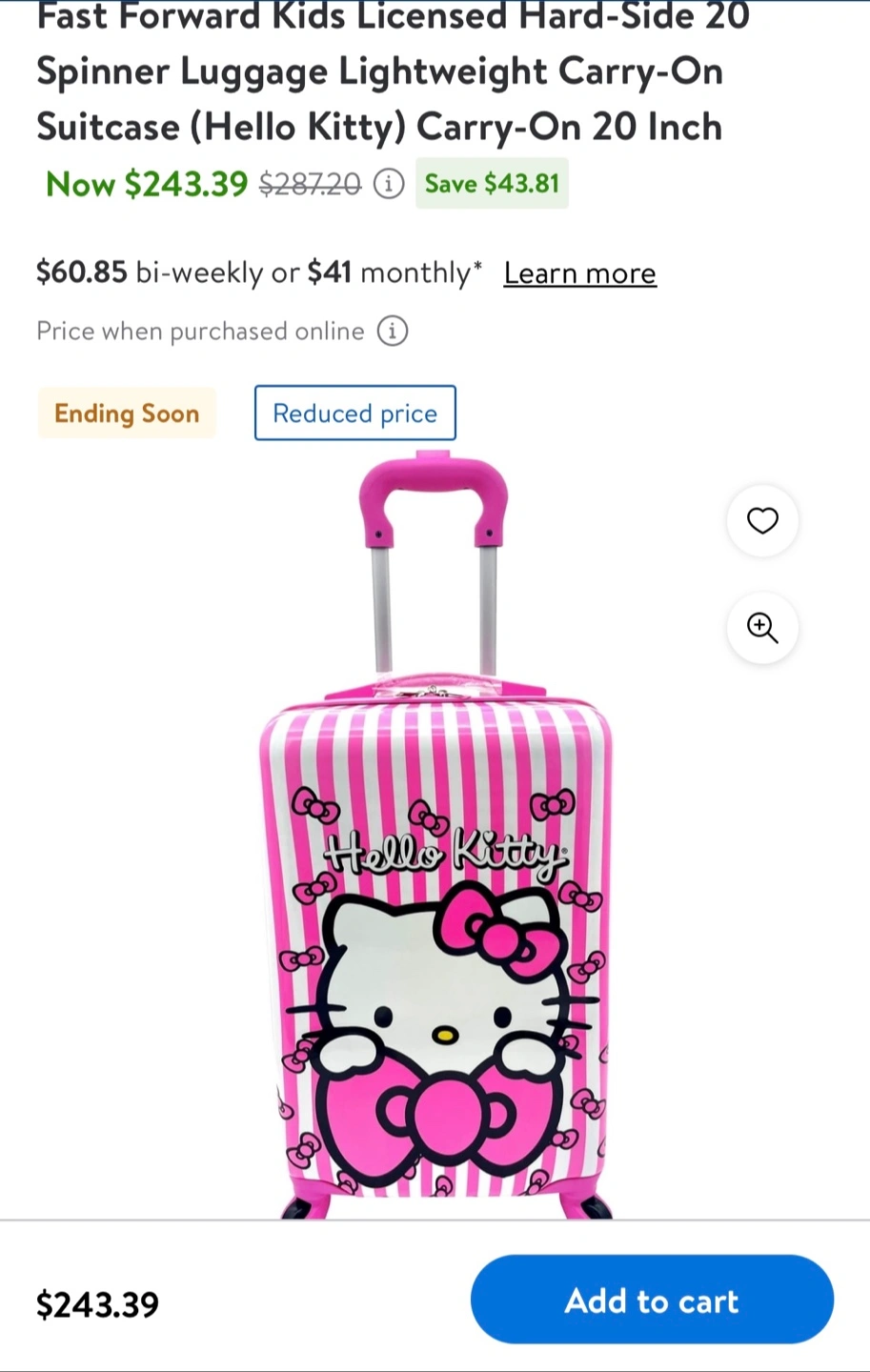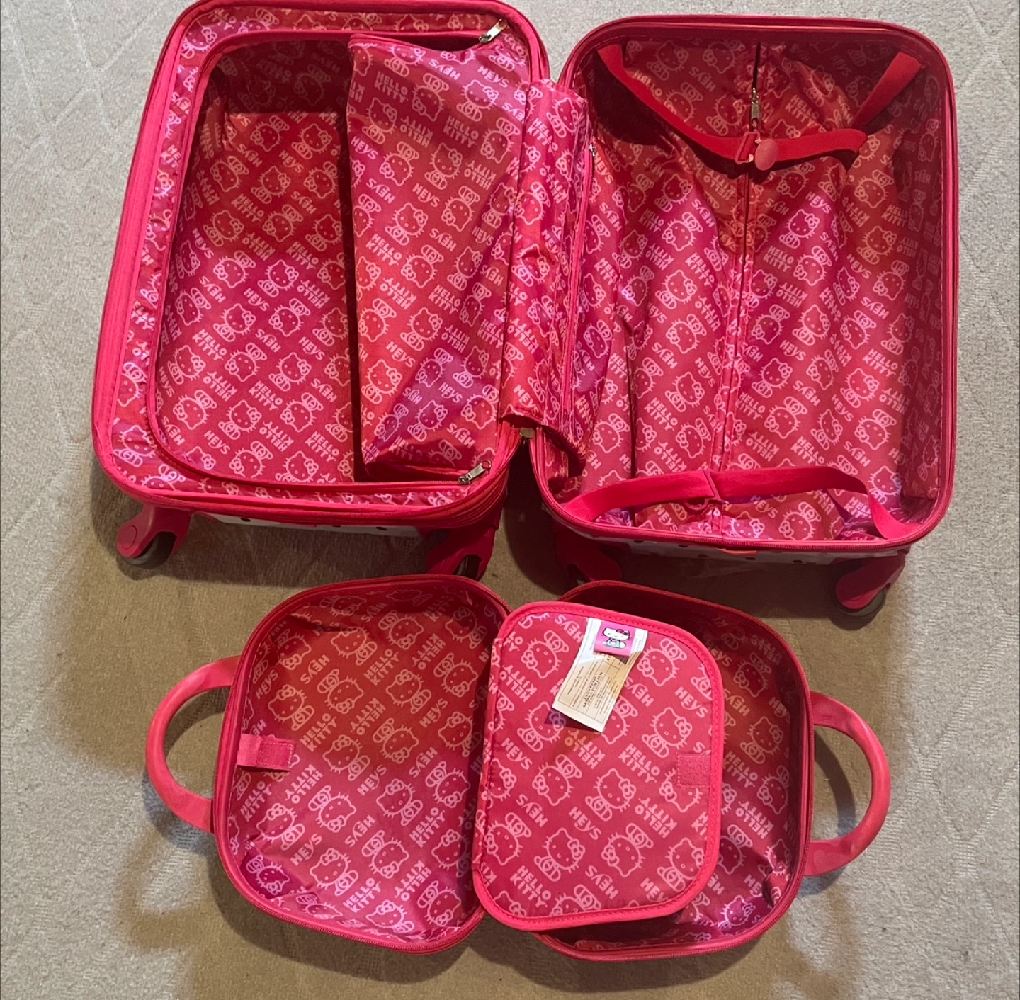 Adorable Hello Kitty luggage set. Includes a carry-on suitcase and a smaller cosmetic case. Pink and white polka dot design. Features Hello Kitty graphics. Lightweight and easy to manoeuvre. Perfect for kids.