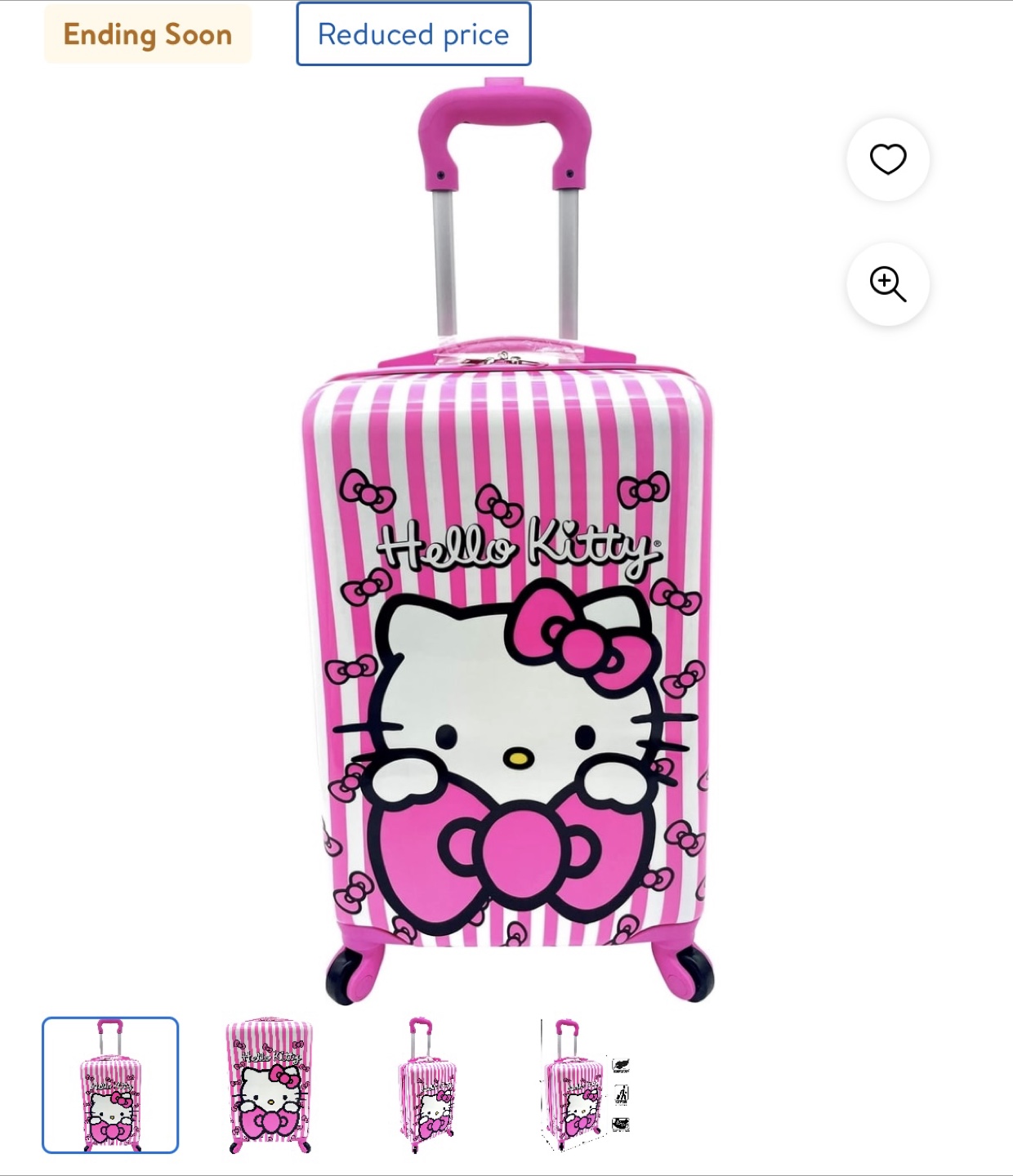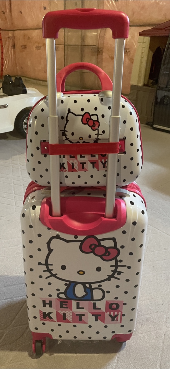 Adorable Hello Kitty luggage set. Includes a carry-on suitcase and a smaller cosmetic case. Pink and white polka dot design. Features Hello Kitty graphics. Lightweight and easy to manoeuvre. Perfect for kids.