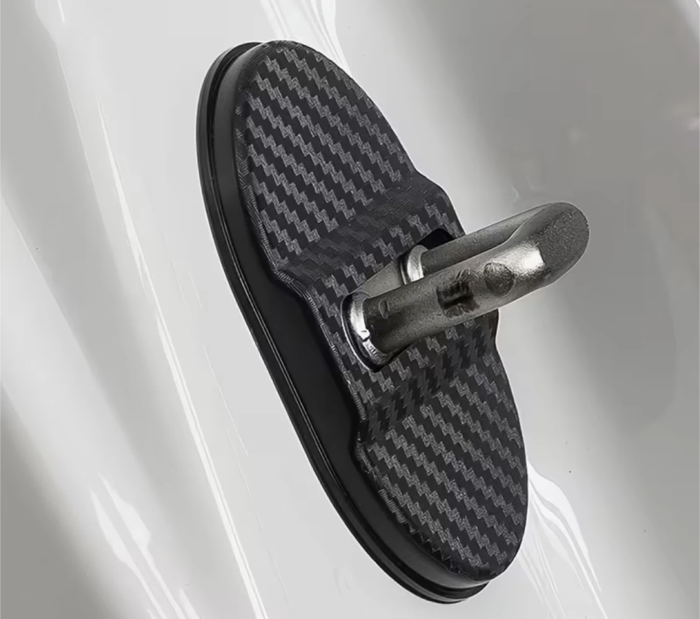 Set of 4 carbon fiber style door lock latch covers. These are designed to fit over your car's door lock latches for a stylish upgrade. They have a carbon fiber pattern and measure 8cm by 6cm. This is a great way to add a custom touch to your vehicle's interior.