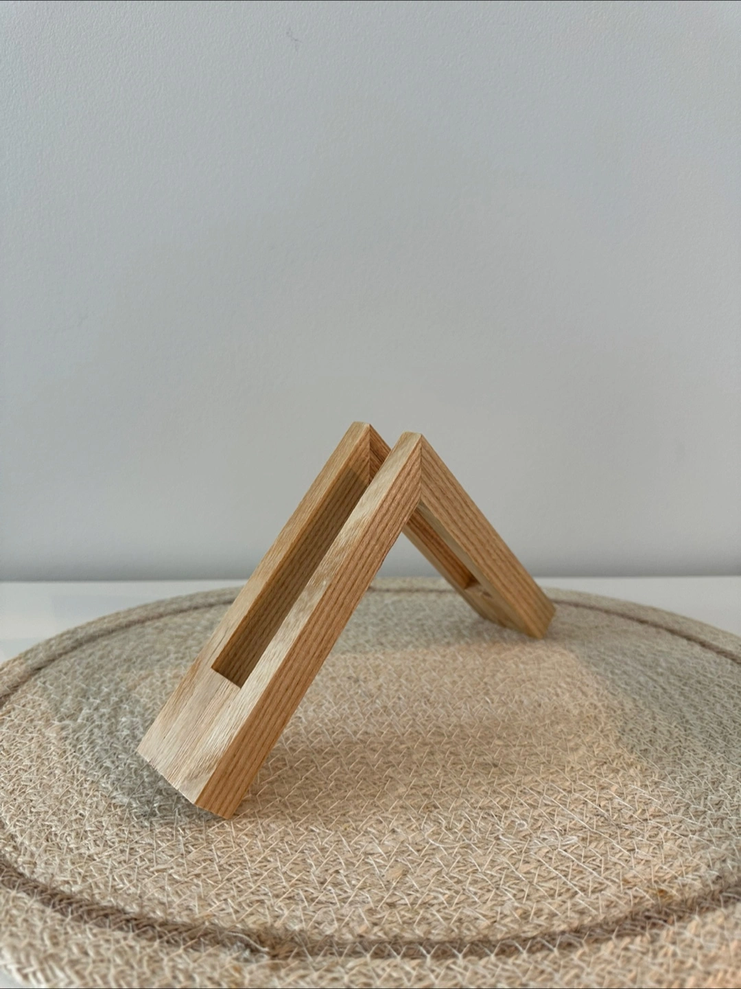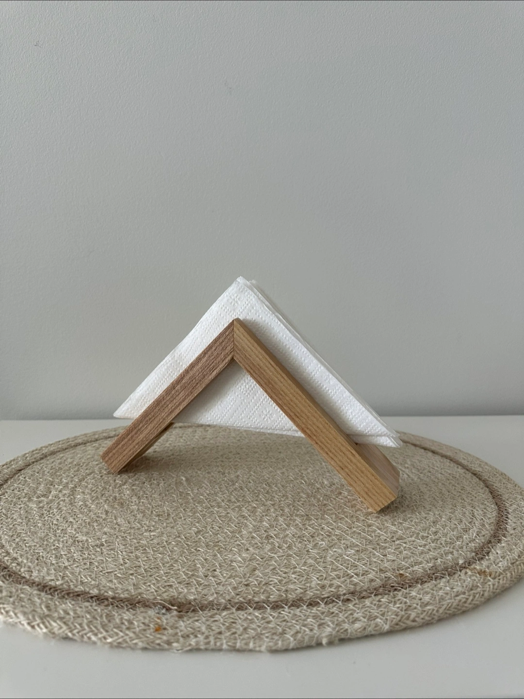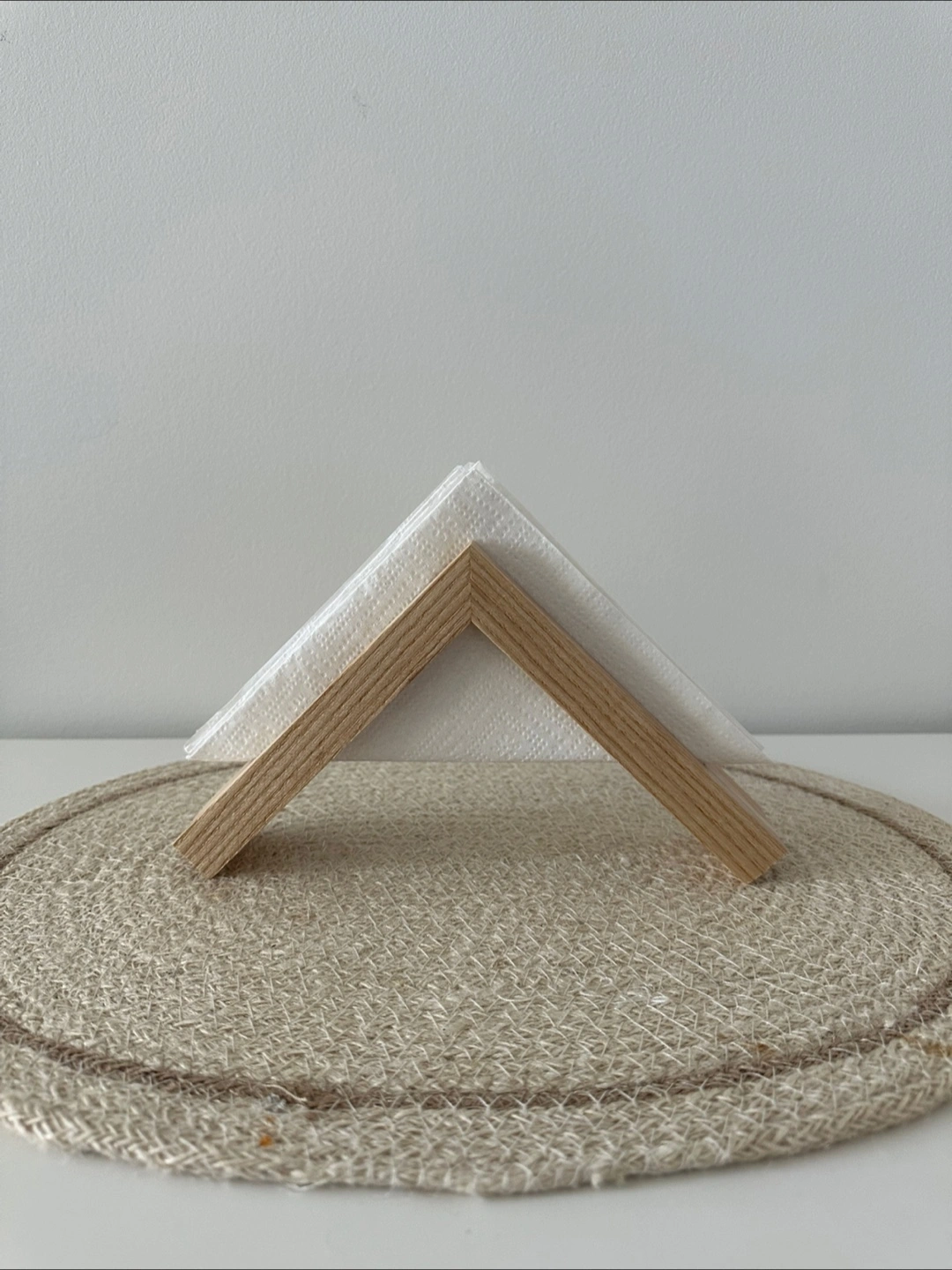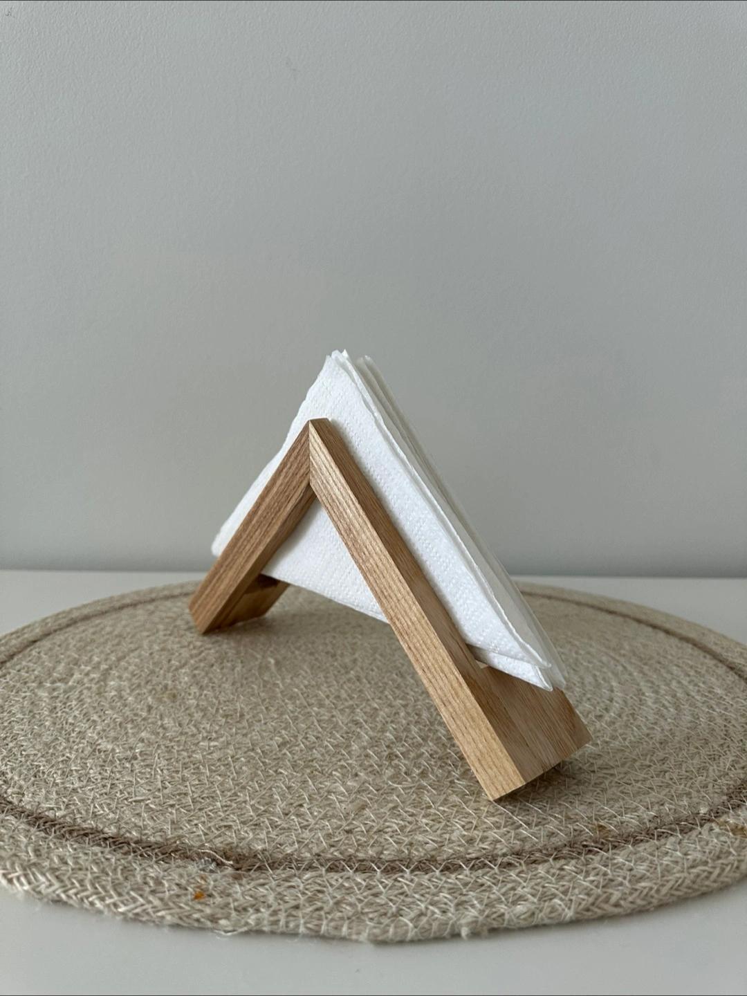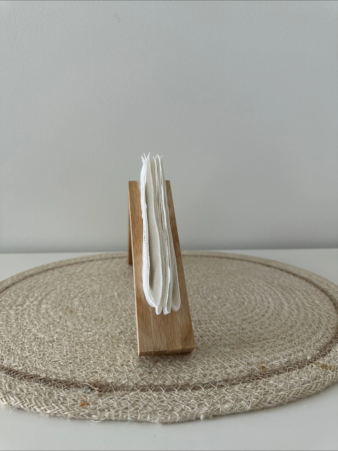 This wooden napkin holder is ideal for keeping napkins tidy on a table or counter. Features a triangular shape with a flat base. Made of light-coloured wood. The stand holds a stack of white square napkins that are also included.
