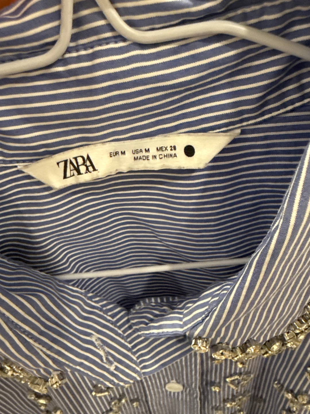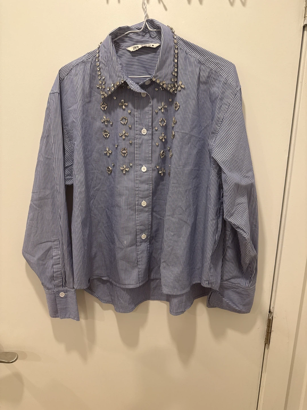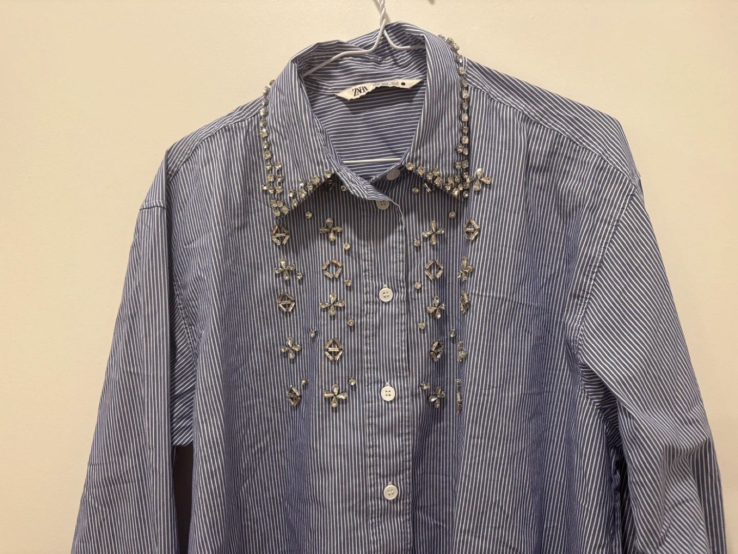 This ZARA collared shirt is a size medium and features a classic blue and white stripe pattern. It's embellished with rhinestones around the collar and down the front. Perfect for adding a bit of sparkle to your everyday look!
