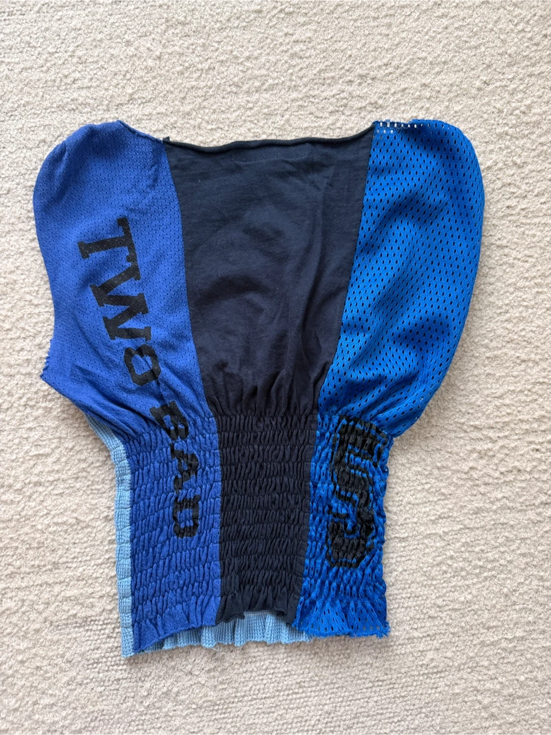 A unique, patchwork top featuring mesh panels and "TWO BAD" text. The fabric is stretchy with smocked detailing at the waist.
