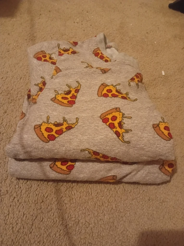 Cute pizza print pajama set! The set includes a long-sleeved top and matching pants. Perfect for cozy nights in!