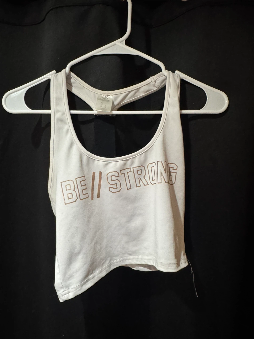 White athletic tank top with "BE STRONG" graphic. Racerback design for comfortable movement. Polyester/spandex blend.