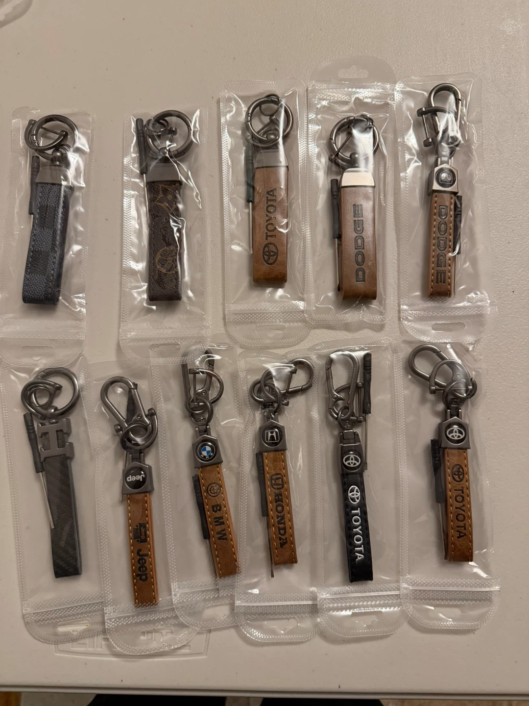 Set of car brand keychains. Includes Toyota, Dodge, BMW, Honda, and Jeep branded items. Made with leather and metal accents. They're perfect for car enthusiasts!