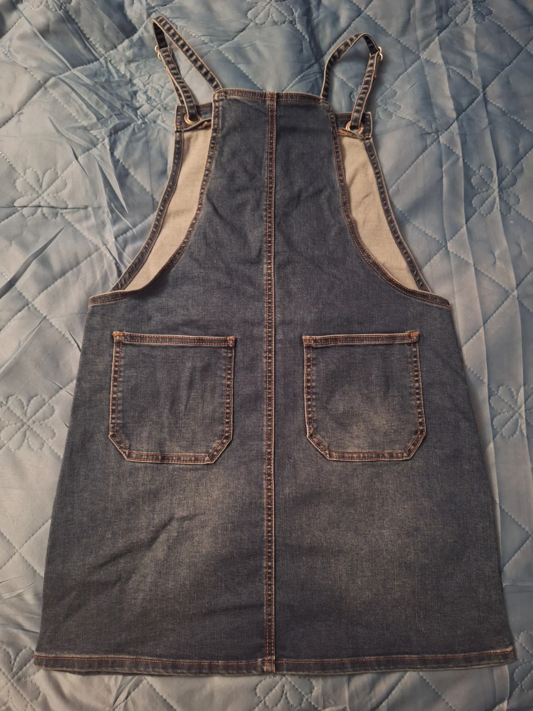 Here's a cute denim jumper dress! It has a classic, casual look that's perfect for layering or wearing on its own. It features pockets on the front and back. It's in great condition and ready for a new wardrobe