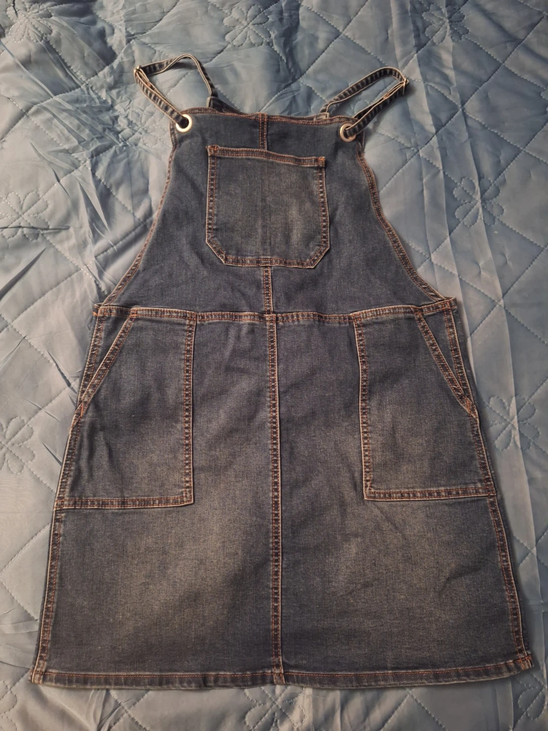 Here's a cute denim jumper dress! It has a classic, casual look that's perfect for layering or wearing on its own. It features pockets on the front and back. It's in great condition and ready for a new wardrobe