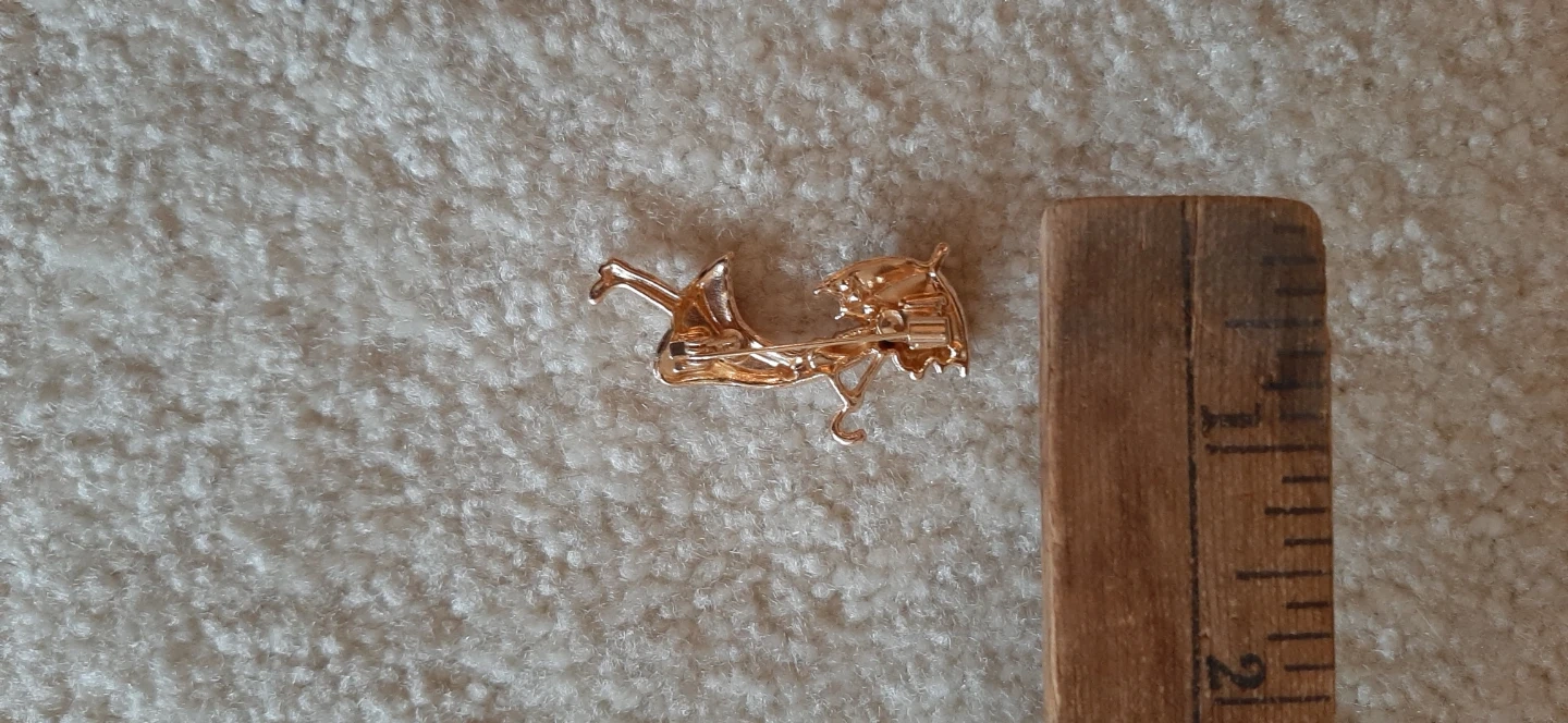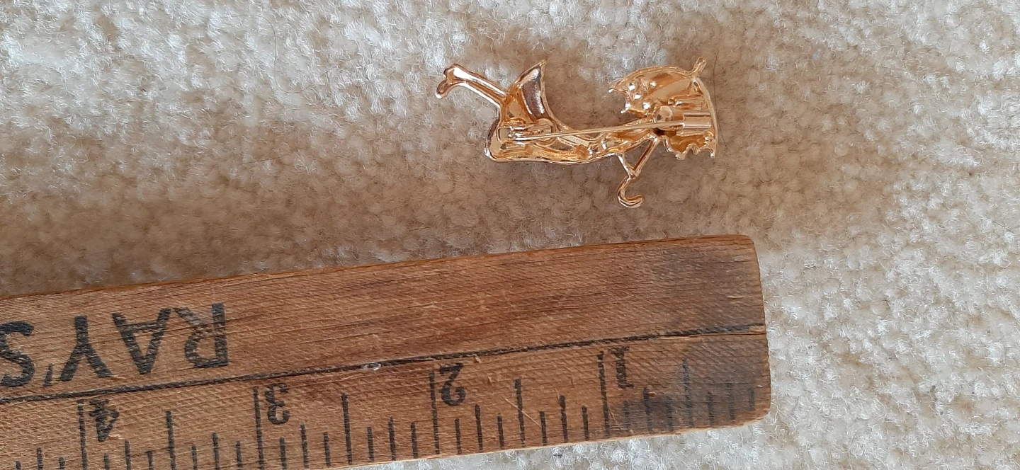 A charming enamel pin featuring a girl in a red dress holding a black and white umbrella. It's adorned with sparkling rhinestones. This unique accessory adds a touch of vintage flair to any outfit!