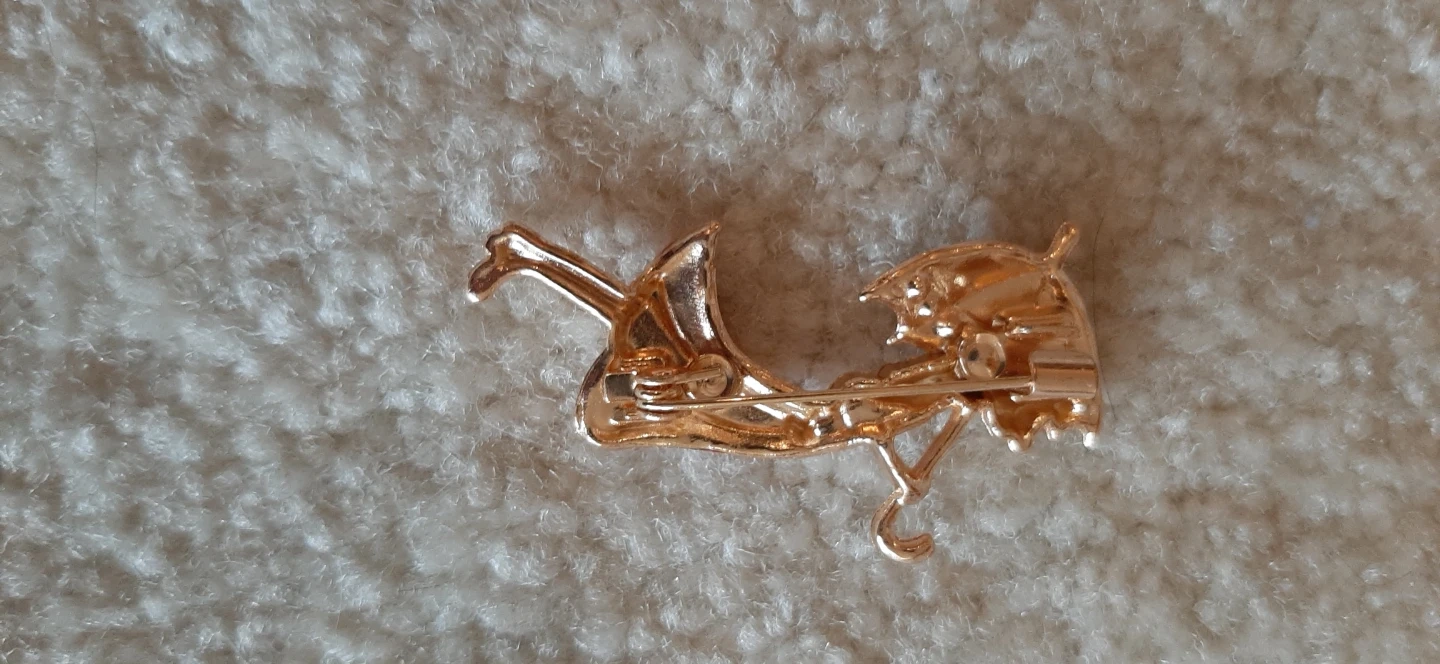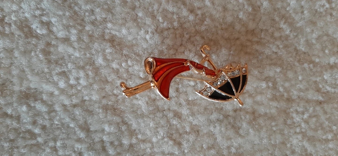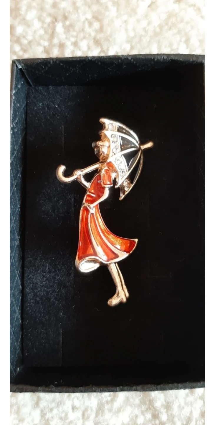 A charming enamel pin featuring a girl in a red dress holding a black and white umbrella. It's adorned with sparkling rhinestones. This unique accessory adds a touch of vintage flair to any outfit!