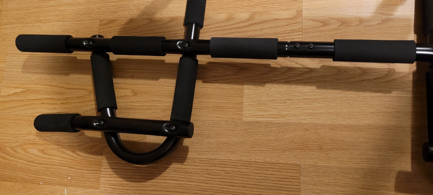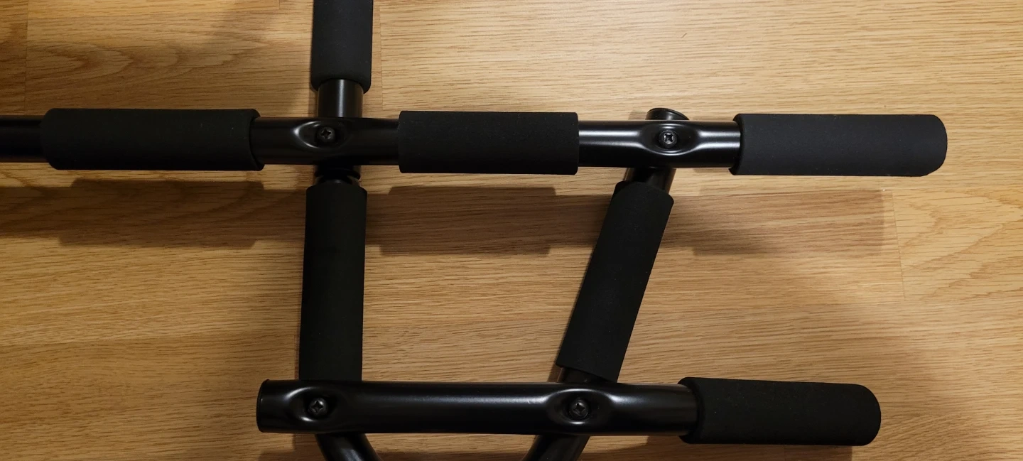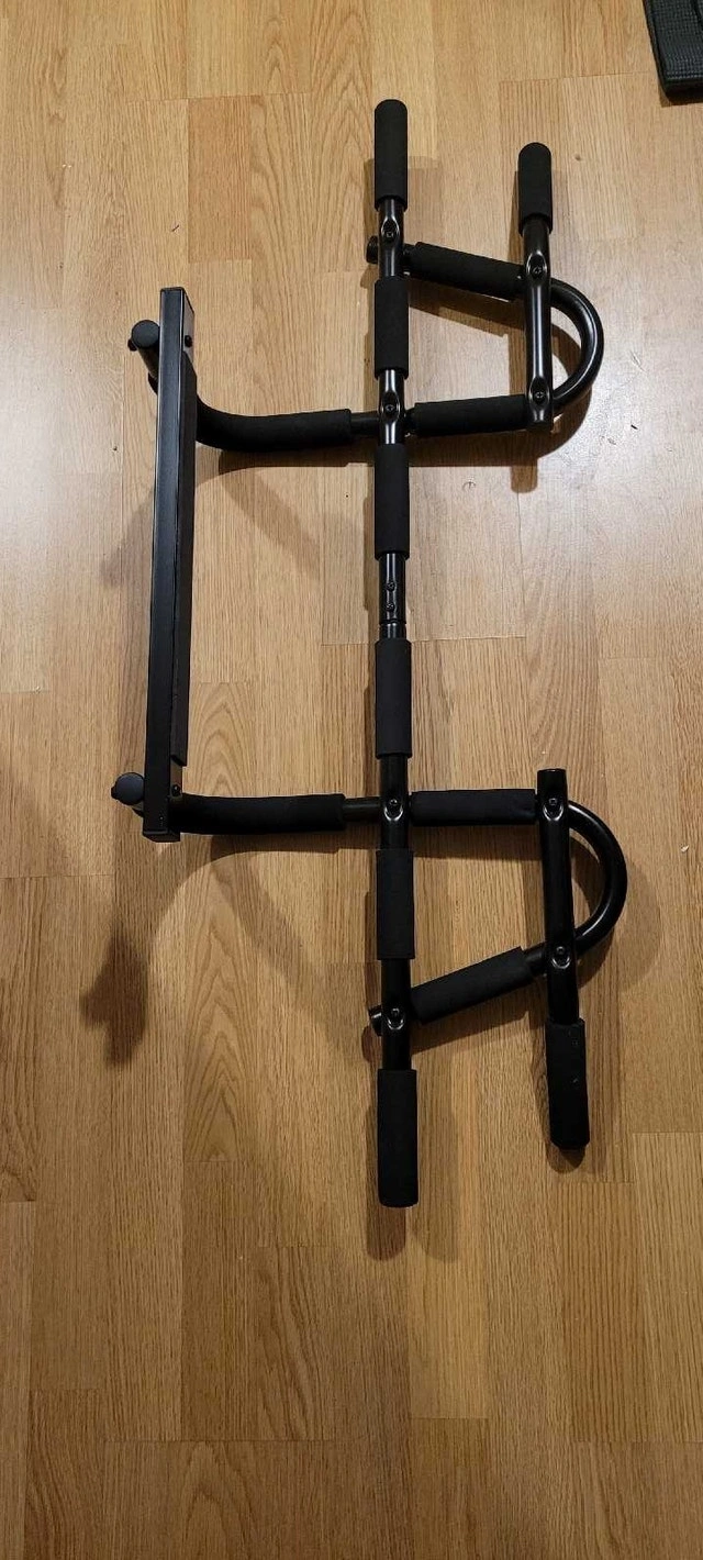 Doorway pull-up and dip bar with multiple grip positions. Heavy-duty steel construction with padded handles for comfort. Great for pull-ups, dips, leg raises, and upper-body workouts. Never used, in like-new condition. Did not have a place to mount it. Hardware not included unless shown.