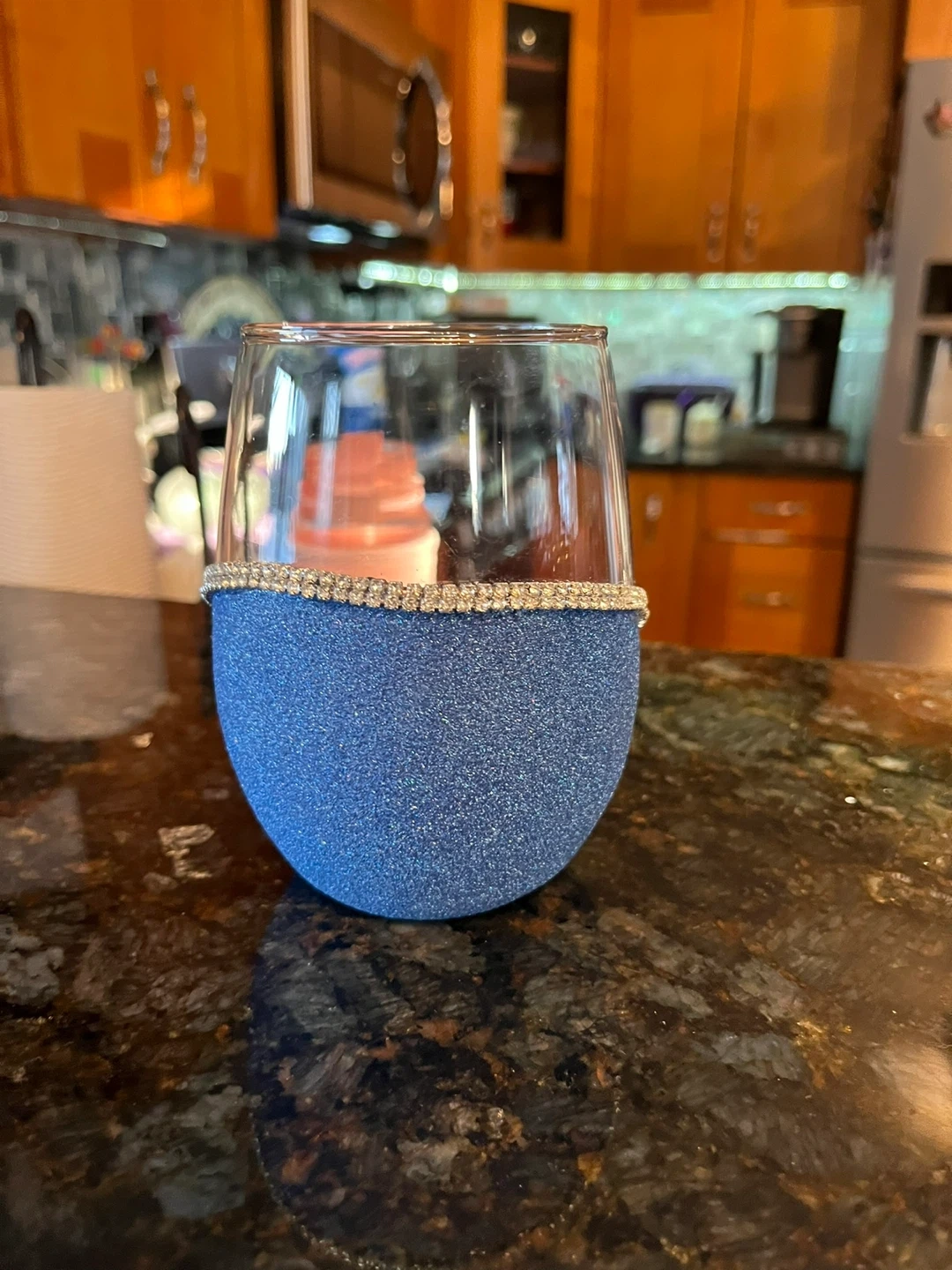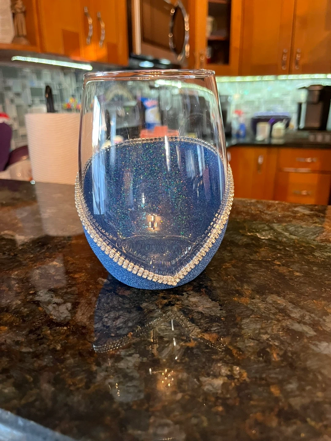 Blue Glitter Stemless Wine Glass with Rhinestone Accent
