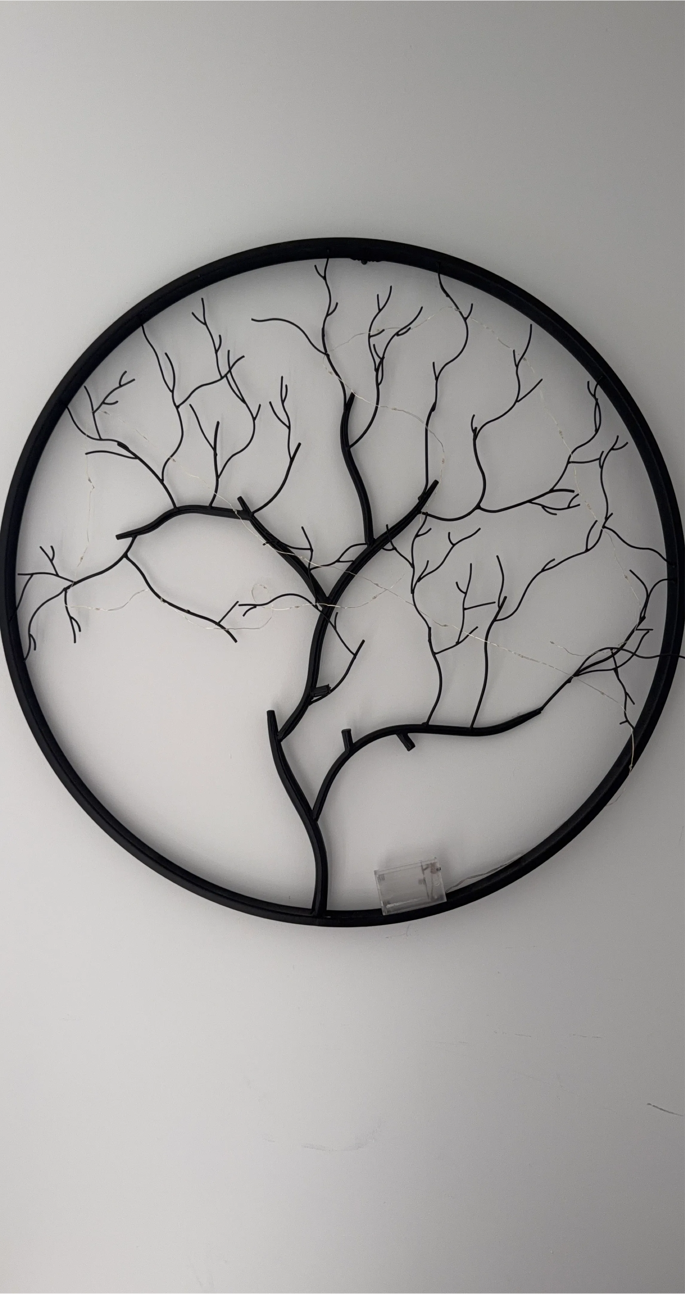 Decorative black metal wall art featuring a tree silhouette. It's accented with delicate string lights for a cozy ambiance. The lights are battery-operated.