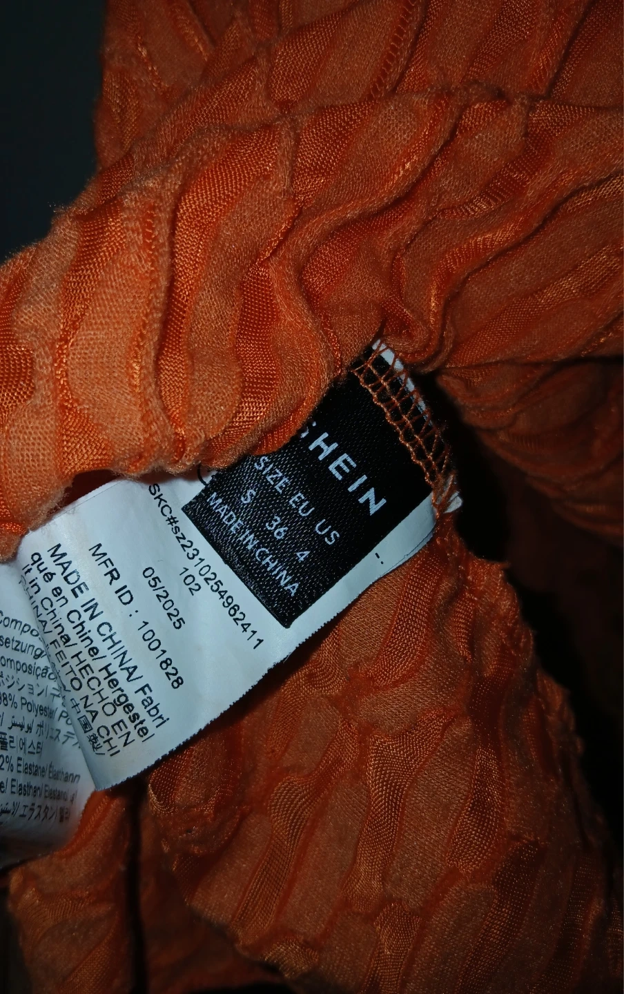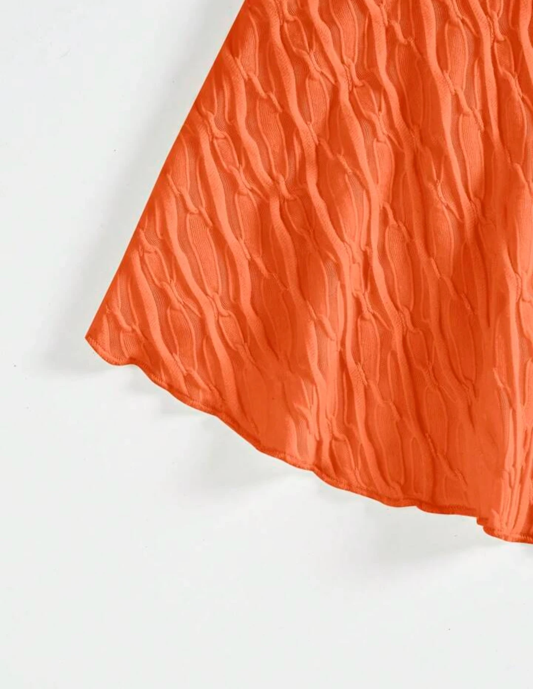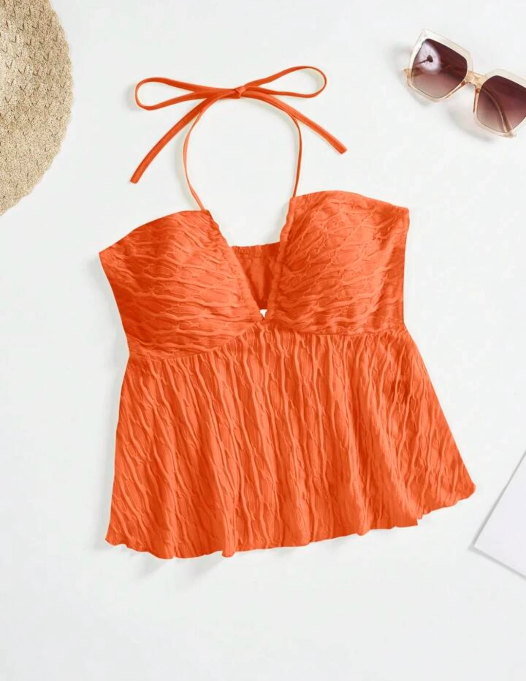 This bright orange halter top has a unique textured fabric and a tie-back closure. It features a ruched bodice and a flared peplum hem. Great for summer wear!