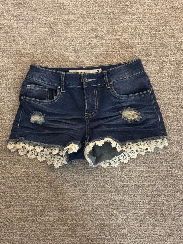 Elevate your wardrobe with these London distressed denim shorts, size small (4-6), featuring stylish lace trim. These shorts are in used-good condition, perfect for adding a touch of edgy flair to any outfit. Specifications: - Brand: London - Size: Small (4-6) - Material: Denim - Condition: Used-Good - Features: Distressed detailing, lace trim. Remember, if the ad is up, the item is available! Given the condition and style, a fair price for these shorts would be around $15 CAD.