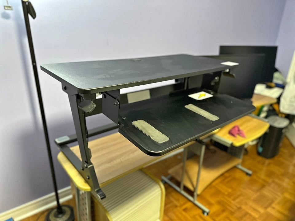 65For sale is a sleek, black, hydraulic-controlled standing desk that’s perfect for anyone looking to enhance their workspace. This desk is not just a piece of furniture, but a solution for a healthier and more dynamic work environment. The standout feature of this desk is its hydraulic control system. With just a simple adjustment, you can easily switch from sitting to standing mode. This flexibility allows you to change your working position throughout the day, promoting better posture and reducing the risk of back pain. The desk is finished in a sophisticated black color that can blend seamlessly with any office decor. Its minimalist design and clean lines give it a modern and professional look. But the features don’t stop there. The desk also comes with an adjustable location to store your keyboard and mouse. This feature allows you to customize your workspace to suit your comfort and needs. I have monitors for sale with this stand. If Ad is up, it's available.