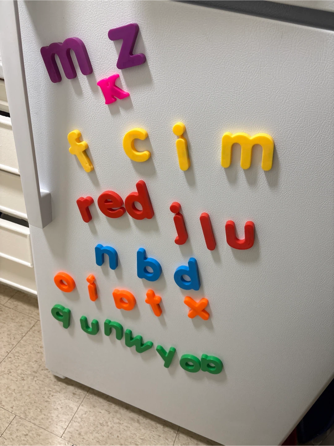 Various magnetic letters in different colours. They're great for spelling words or teaching the alphabet. These letters are fun and engaging for little ones!