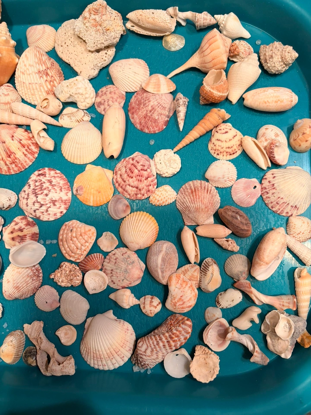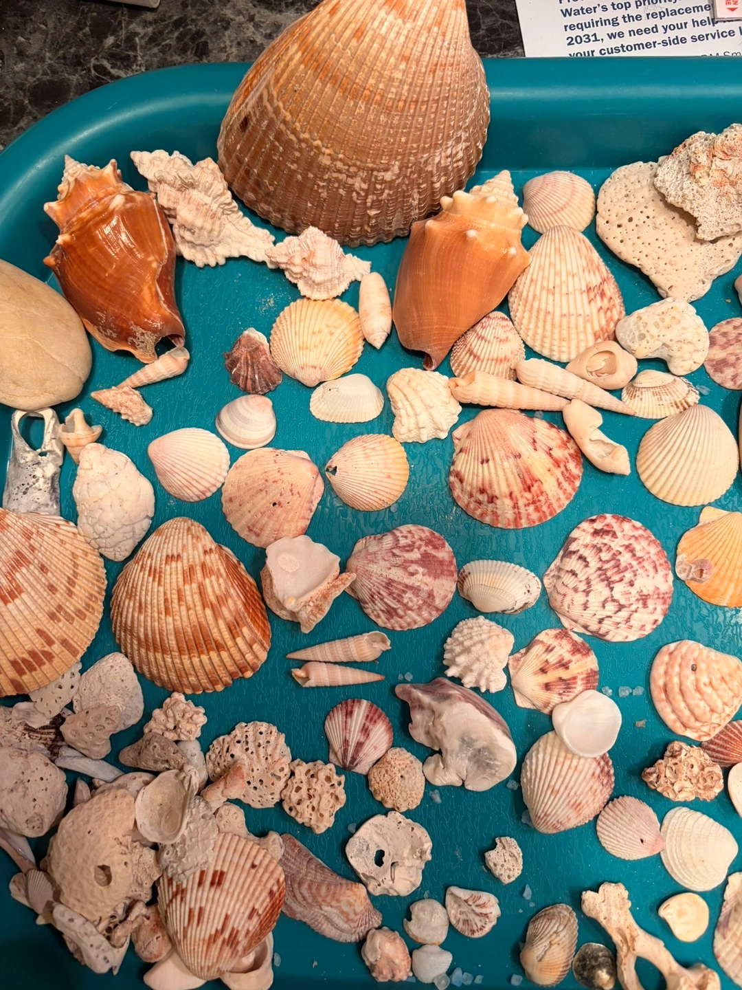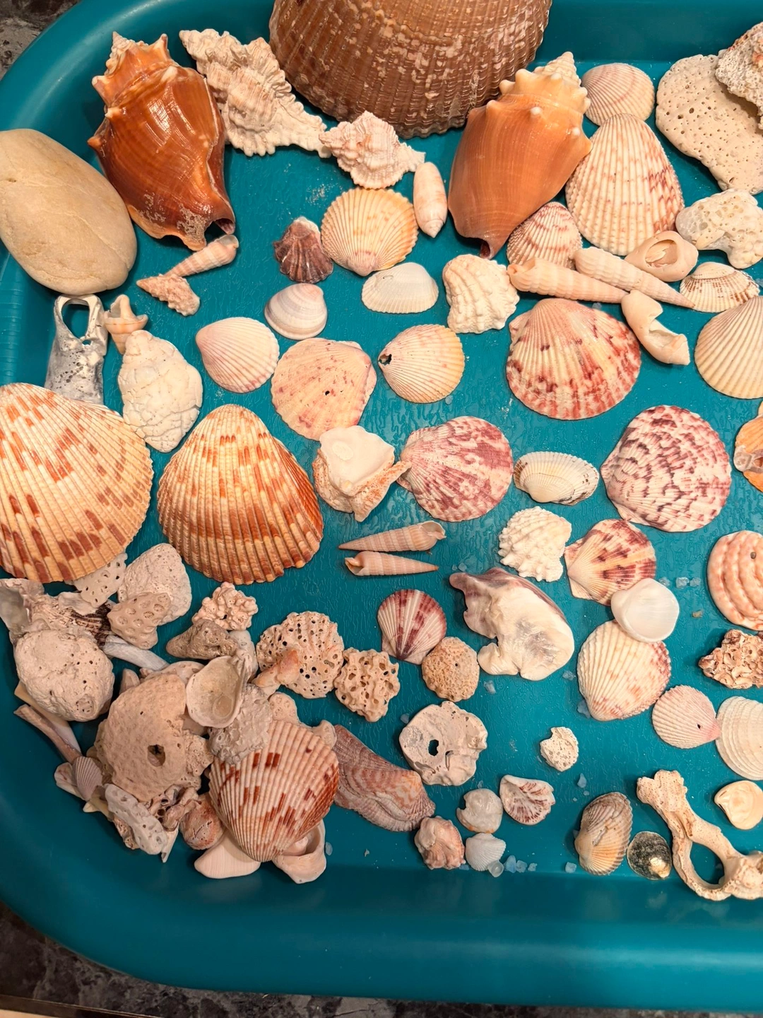 All different kinds of sea shells from Sanibel Island, found by me. The bottom right are interesting pieces of shells/rocks. I transported them safely to NJ.