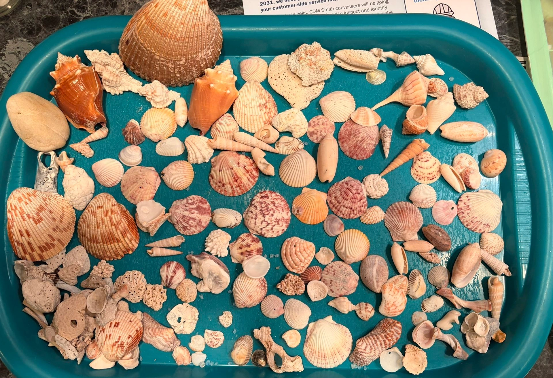 All different kinds of sea shells from Sanibel Island, found by me. The bottom right are interesting pieces of shells/rocks. I transported them safely to NJ.