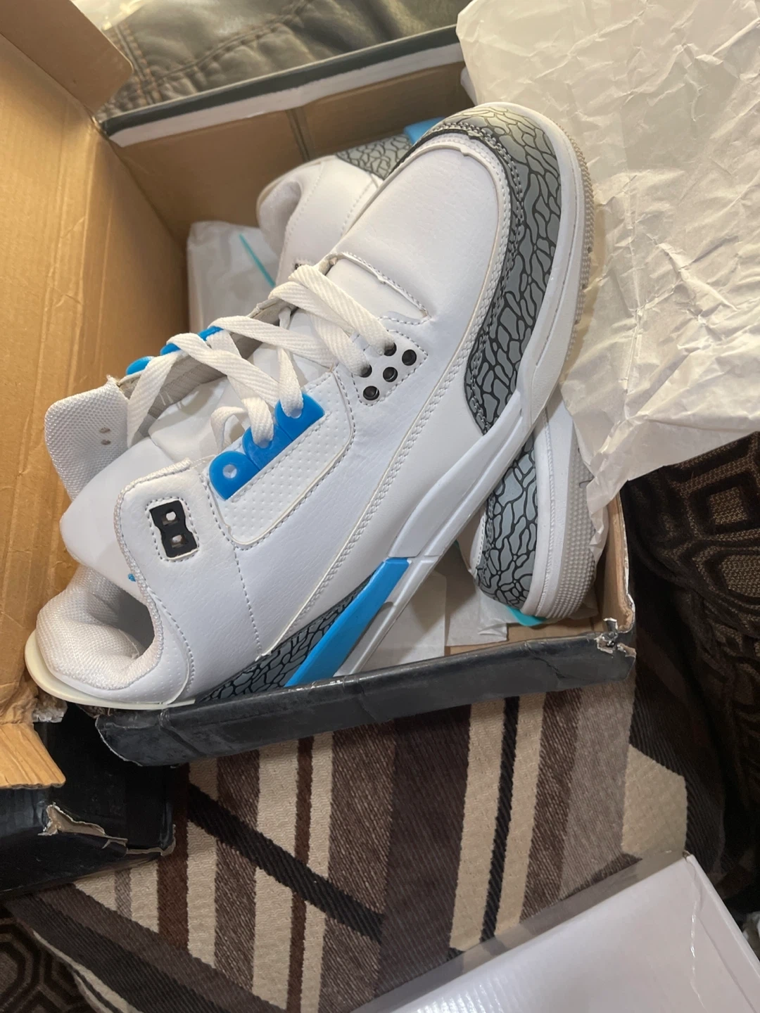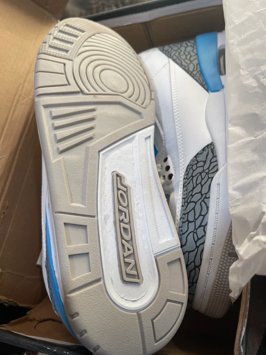 Selling a pair of Jordan 3 Retro sneakers in white and blue! They come with the original box. These shoes are in great condition and ready for a new owner