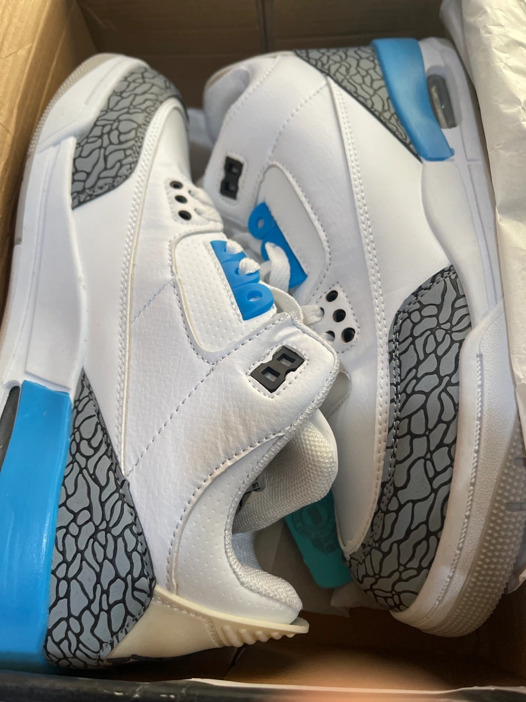Selling a pair of Jordan 3 Retro sneakers in white and blue! They come with the original box. These shoes are in great condition and ready for a new owner
