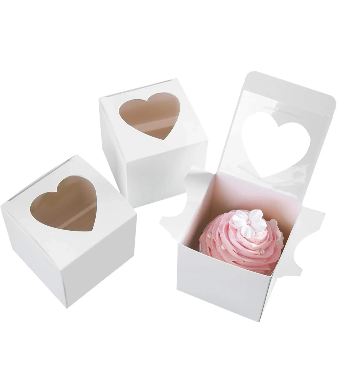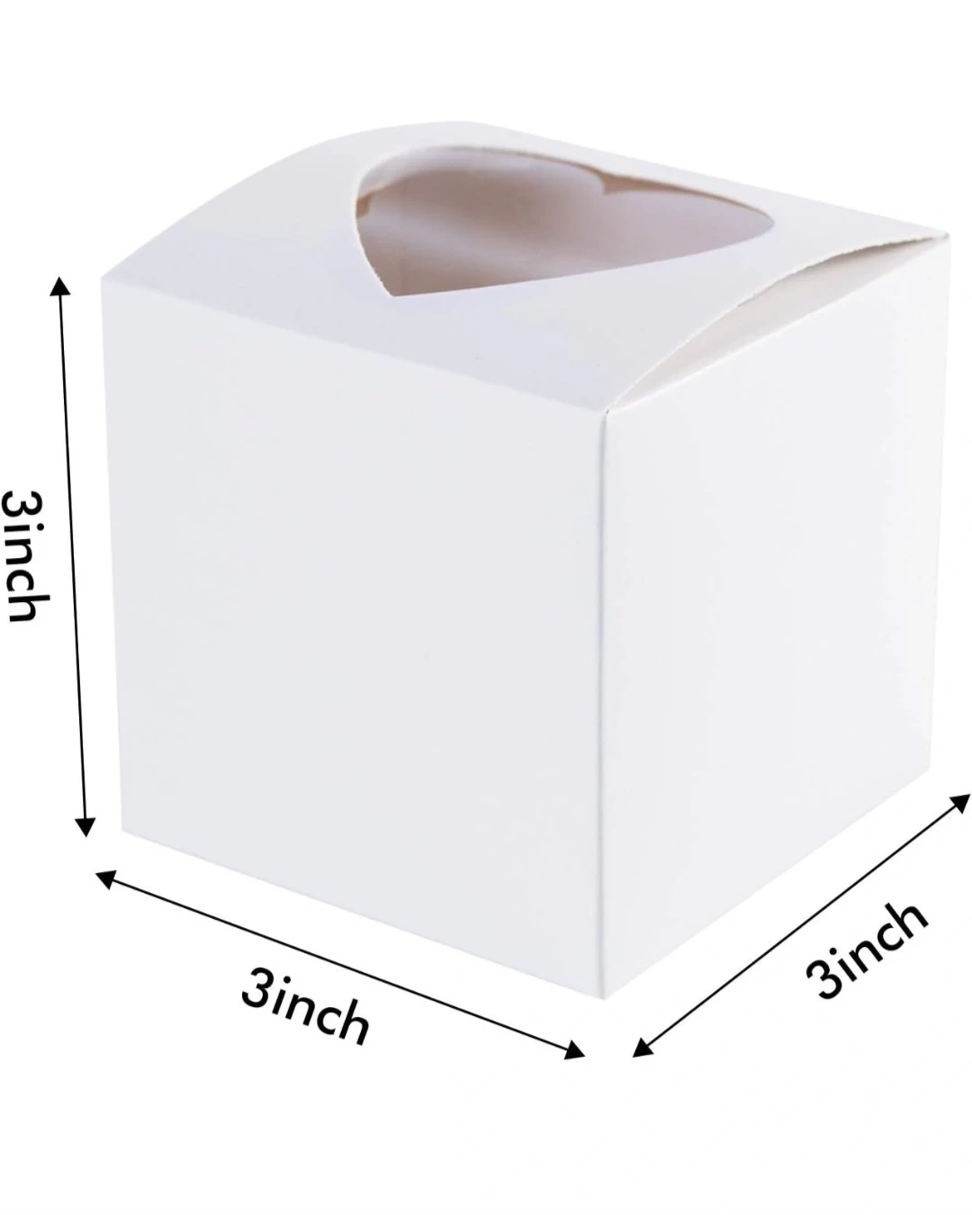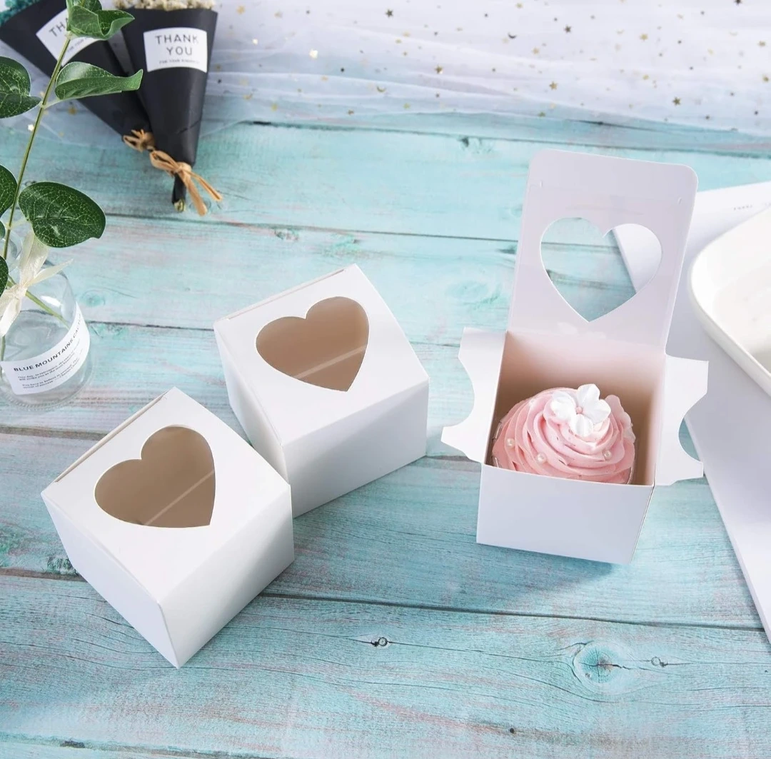 These are white paper cupcake boxes designed to hold single treats. They feature a clear window on top with a heart cutout. The boxes measure approximately 3 x 3 x 3 inches. Perfect for gifting or selling individual baked goods!