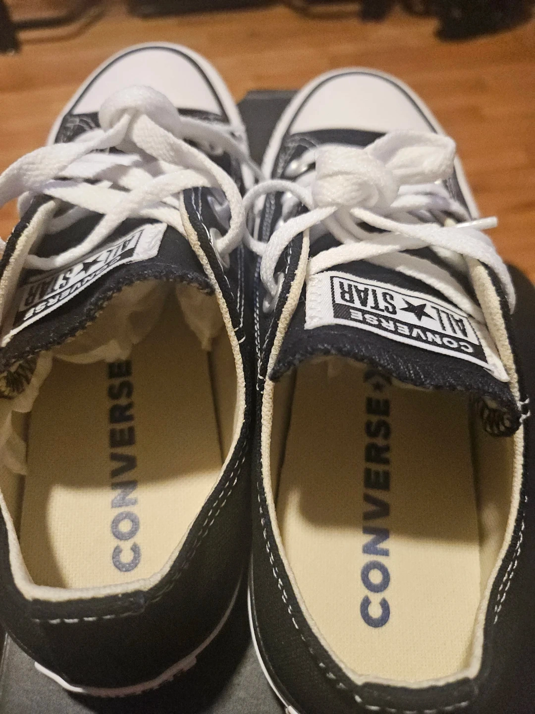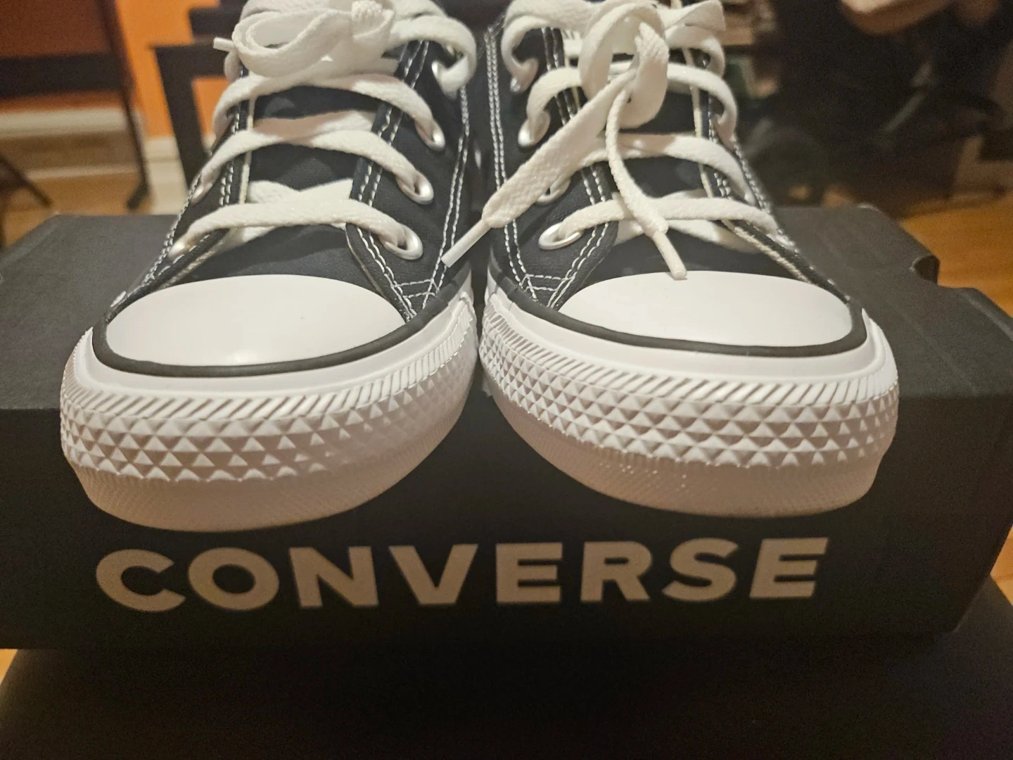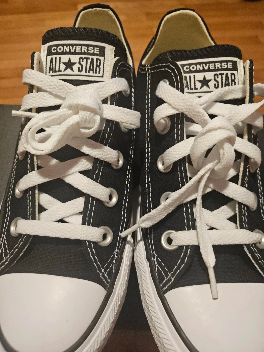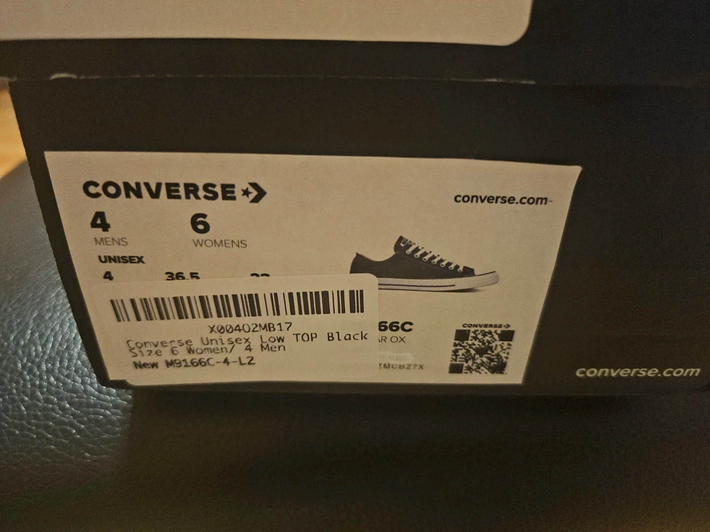 Classic black Converse Chuck Taylor low top sneakers. These are size 6 in women's and 4 in men's sizing. They're made with a canvas upper and rubber sole. Includes original box!