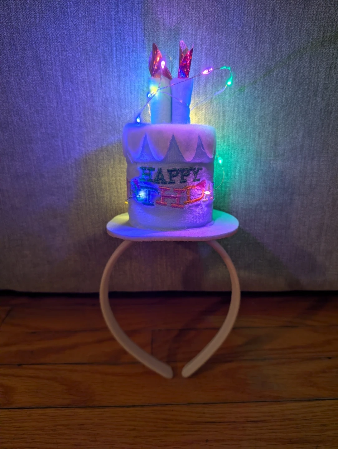 Here's a fun and festive birthday cake headband! It's perfect for birthday parties or just to add a little fun to your day. The headband is in great condition and features the words "Happy Birthday" embroidered on the cake. It has candles on top too!