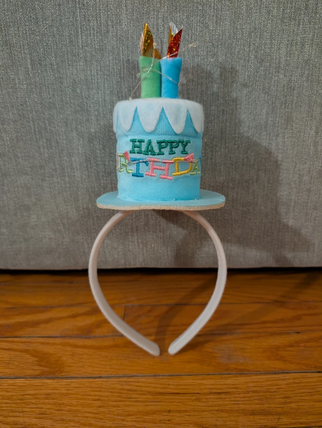 Here's a fun and festive birthday cake headband! It's perfect for birthday parties or just to add a little fun to your day. The headband is in great condition and features the words "Happy Birthday" embroidered on the cake. It has candles on top too!